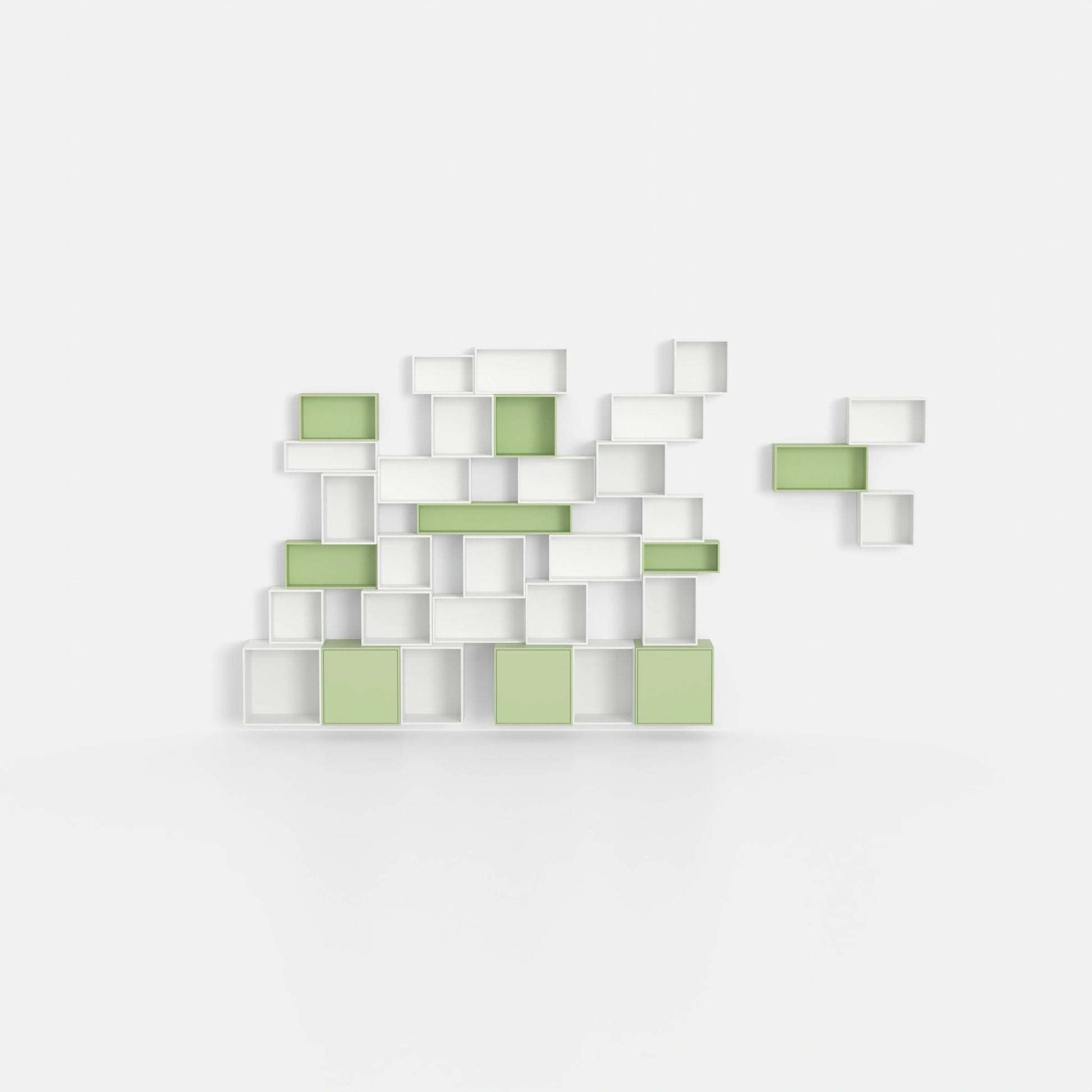 The RK1054 Shelving system impresses with its size: 350 cm wide, 204 cm high, 37 cm deep. It consists of 36 flexible modules. The colors white and peppermint light offer a fresh, clear look. This color combination goes perfectly with modern and classic design.