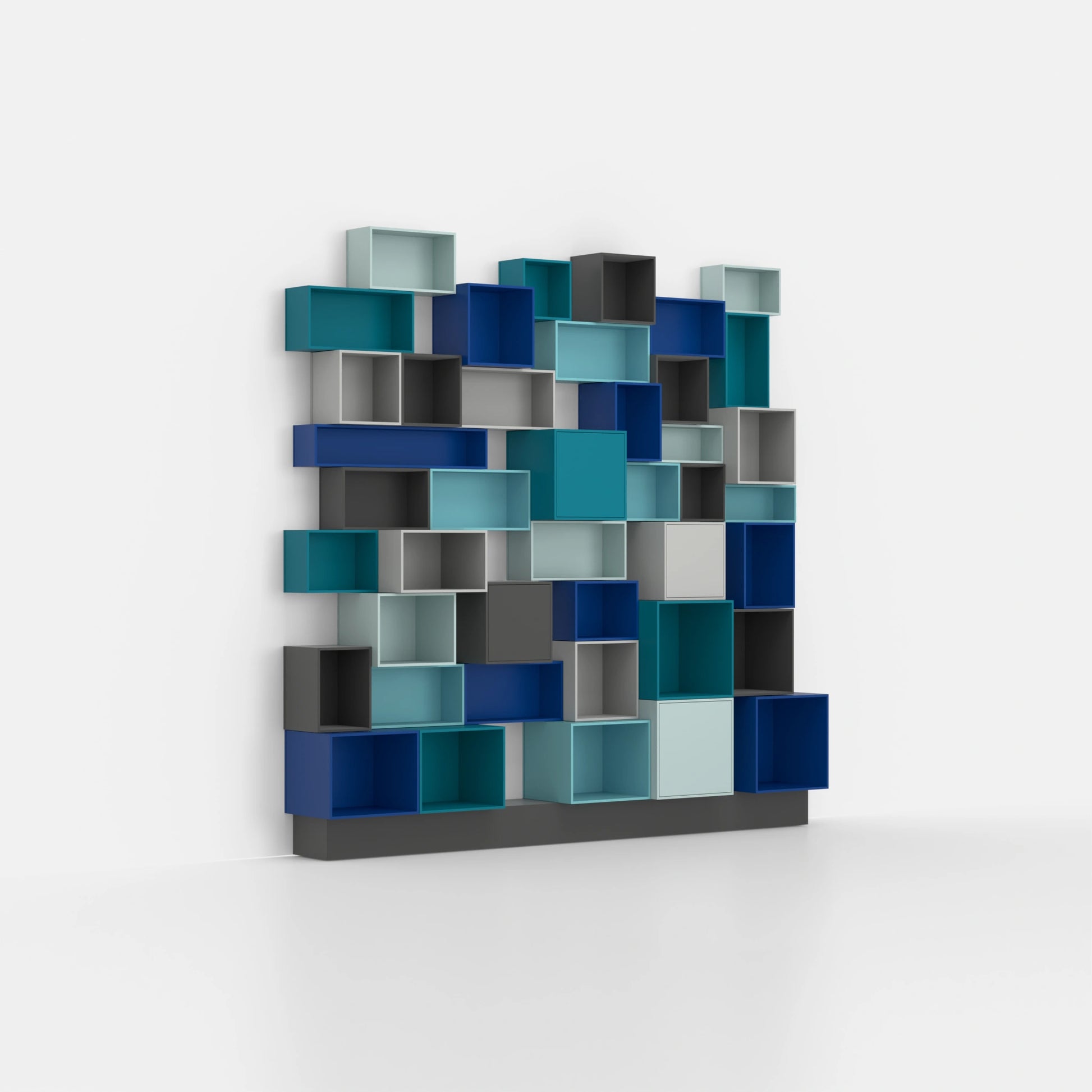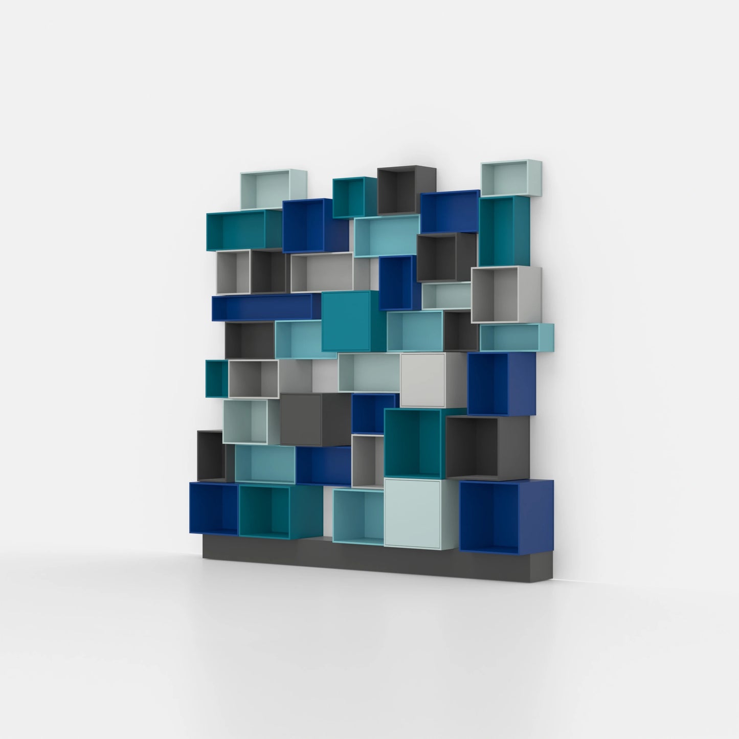 Cubit shelves in all colours of the rainbow as a wall installation, arranged in a flowing colour gradient - an expression of maximum colour variety and design freedom