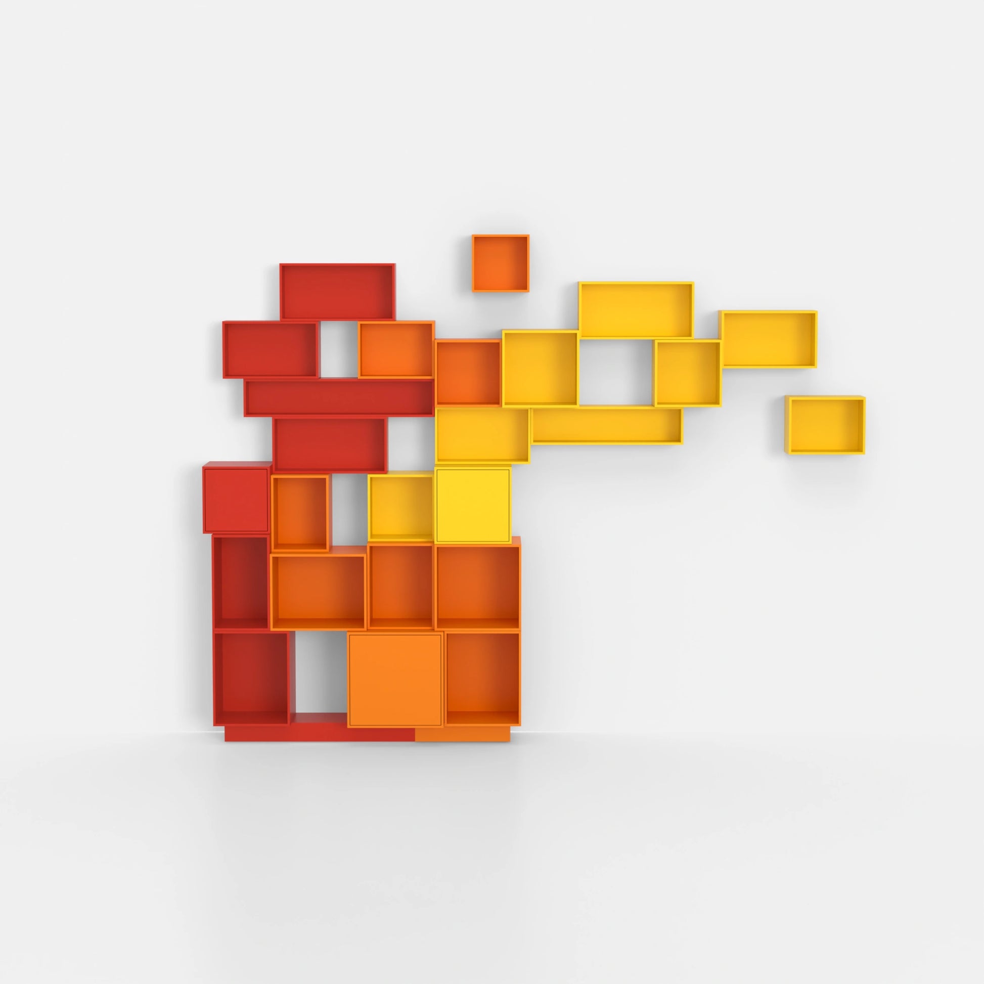 Cubit Wall bookshelf made of coloured modules in shades of red, pink and yellow, dynamically arranged for a lively room design