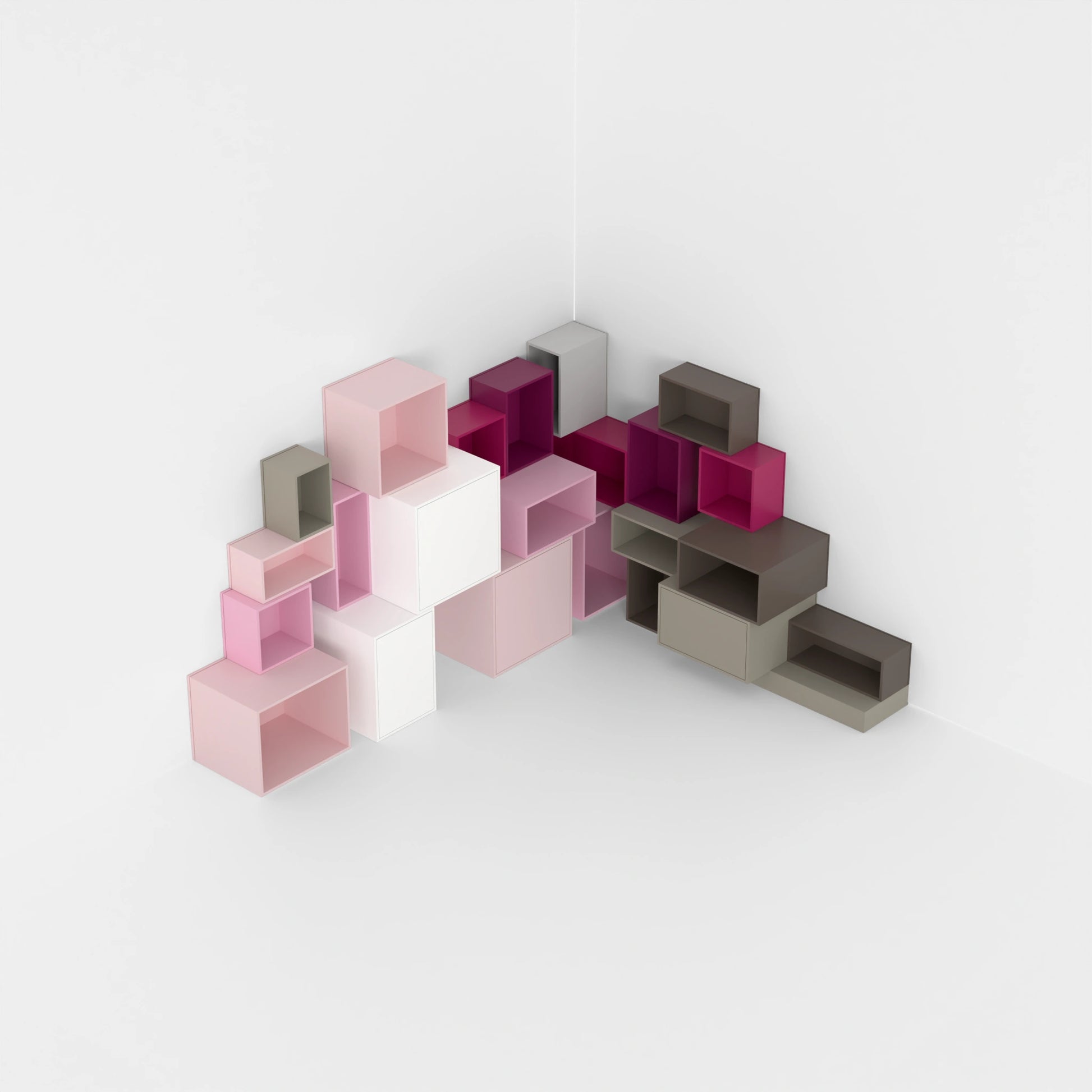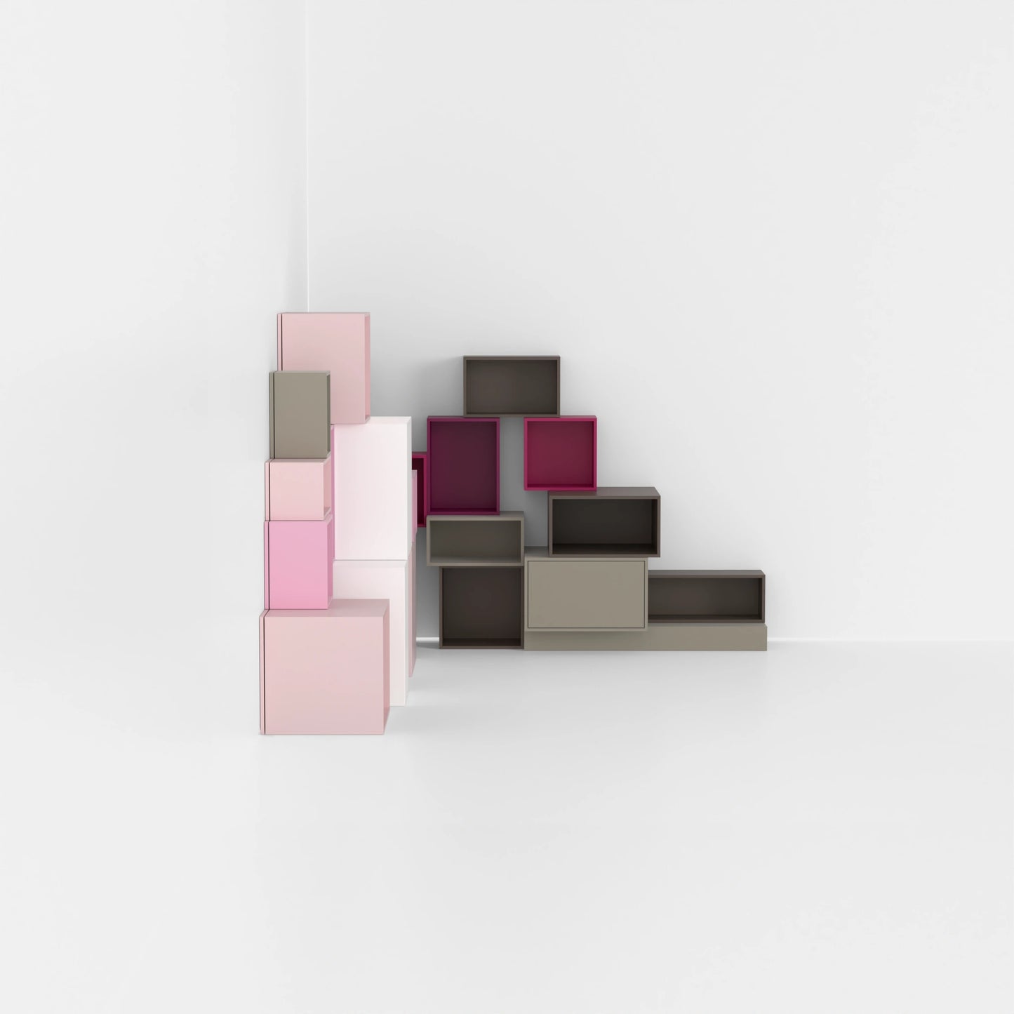 Shelving structure with various Cubit modules in pink and natural tones, combined with door modules and open modules