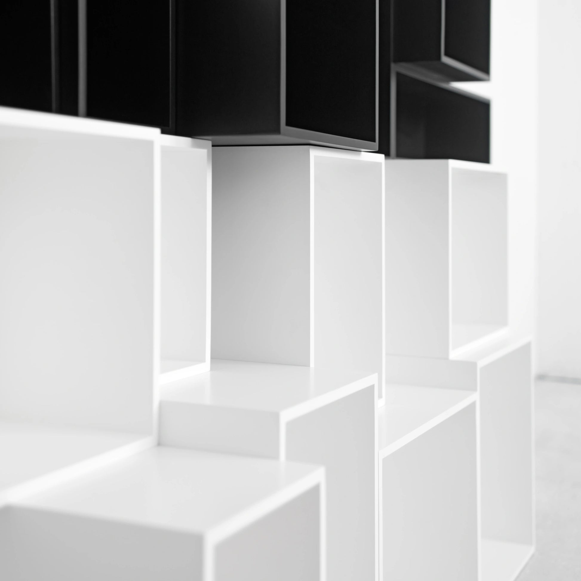 The shelving modules are based on standard literature and music formats, e.g. A4, A5, folders, atlases, illustrated books and records. This size grid based on the contents creates a unique sculptural look.