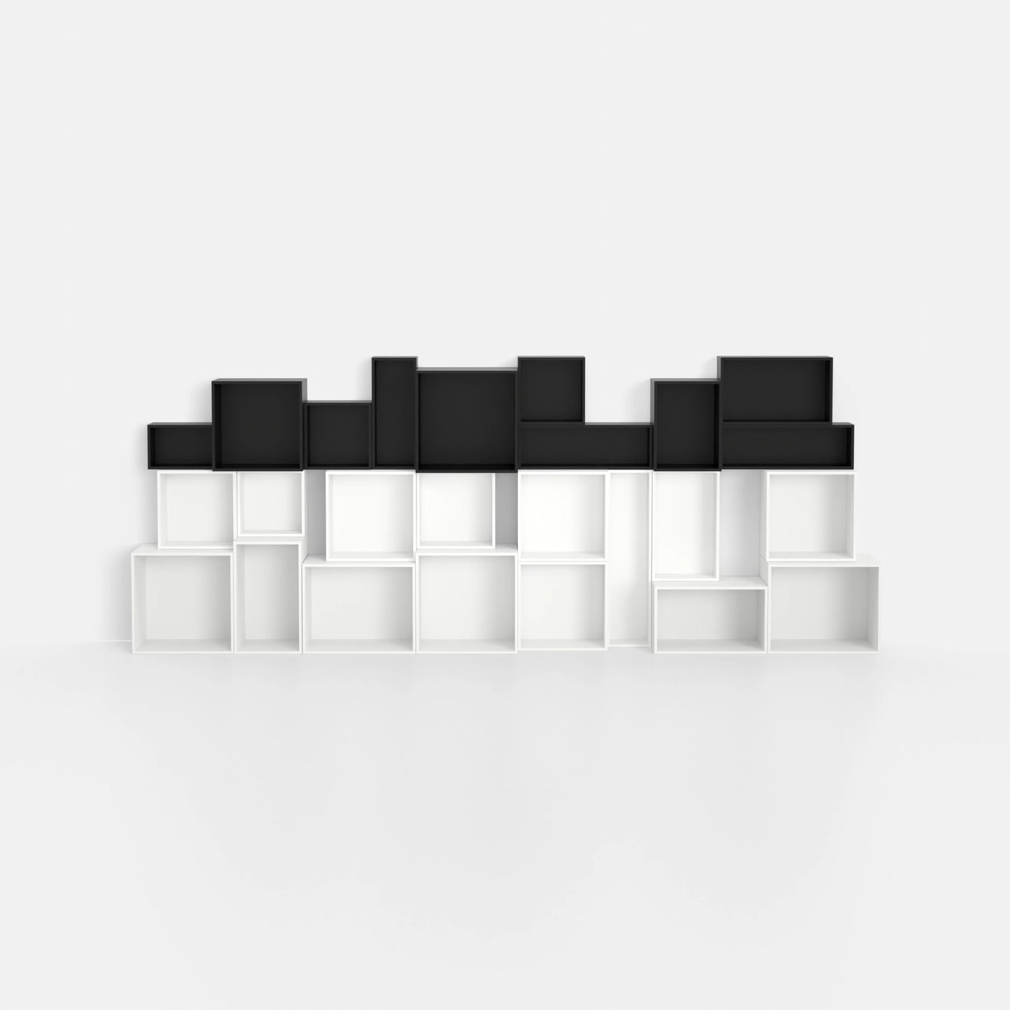 The RK165 Shelving system impresses with its simple design. Ideal for the living room or office. With a depth of 33 cm, a height of 104 cm and a width of 264 cm, it also fits into confined spaces. 25 modules provide space for books and decorations.