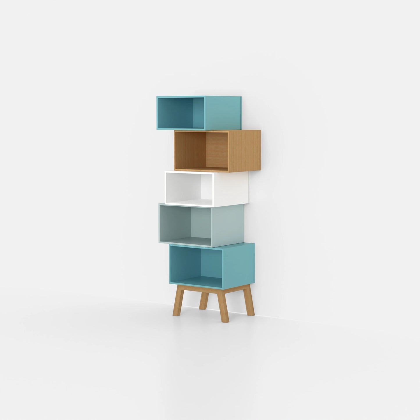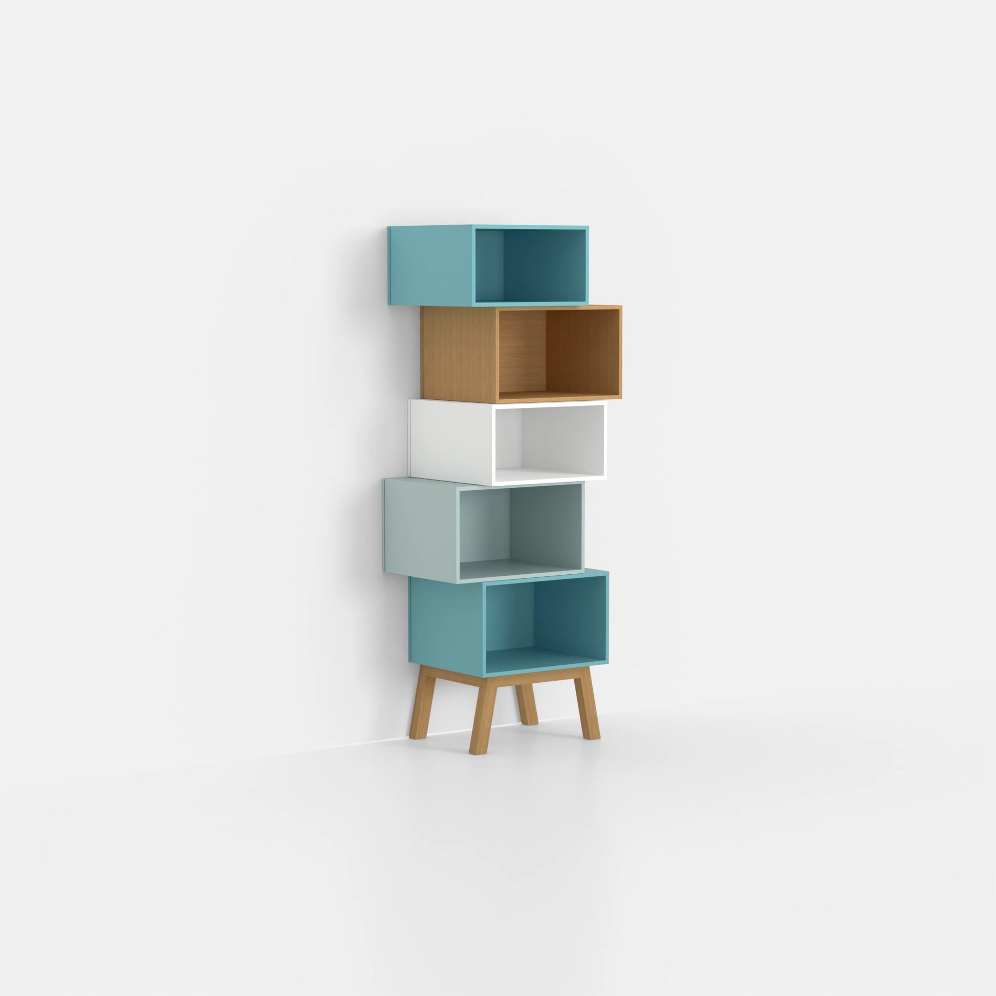 Three modular Cubit shelf boxes, two in light green and one in walnut veneer, arranged freely on the floor, another on a black metal frame