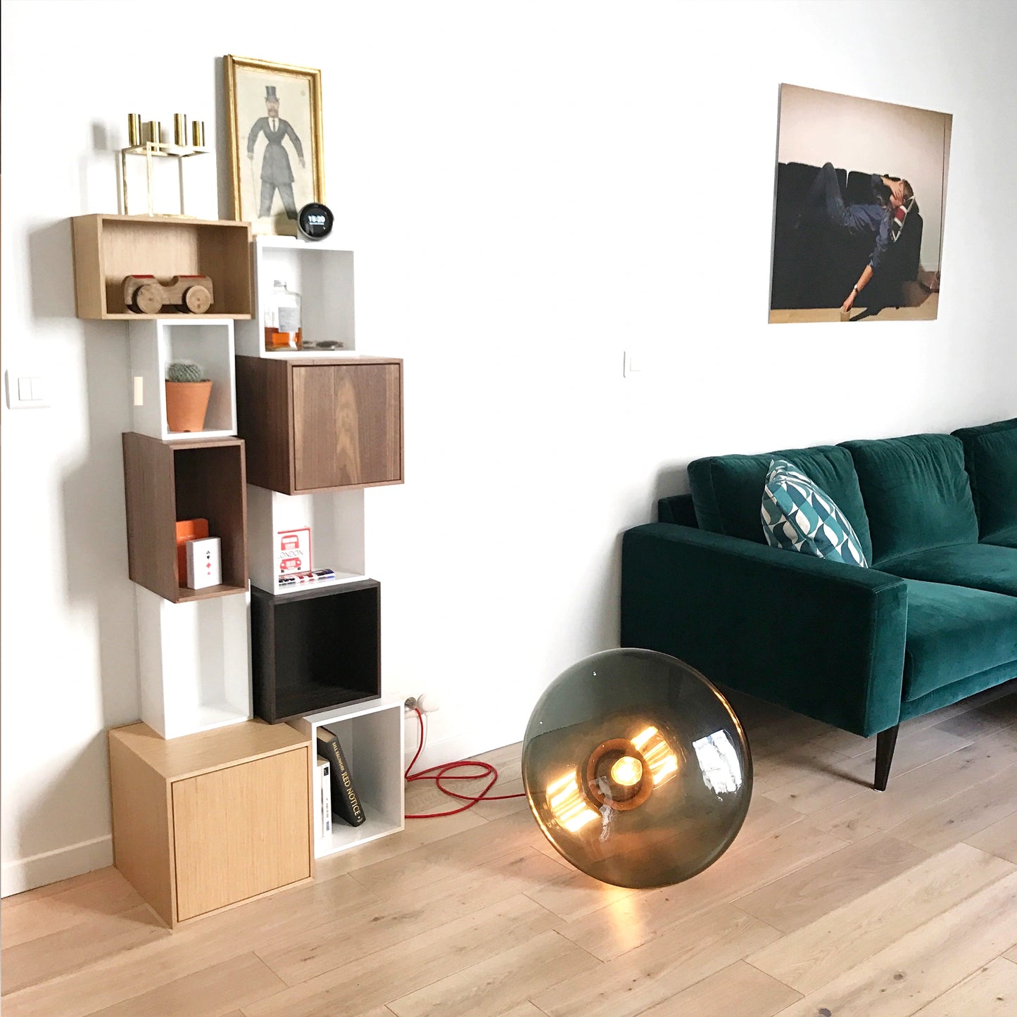 Three modular Cubit shelf boxes, two in light green and one in walnut veneer, arranged freely on the floor, another on a black metal frame