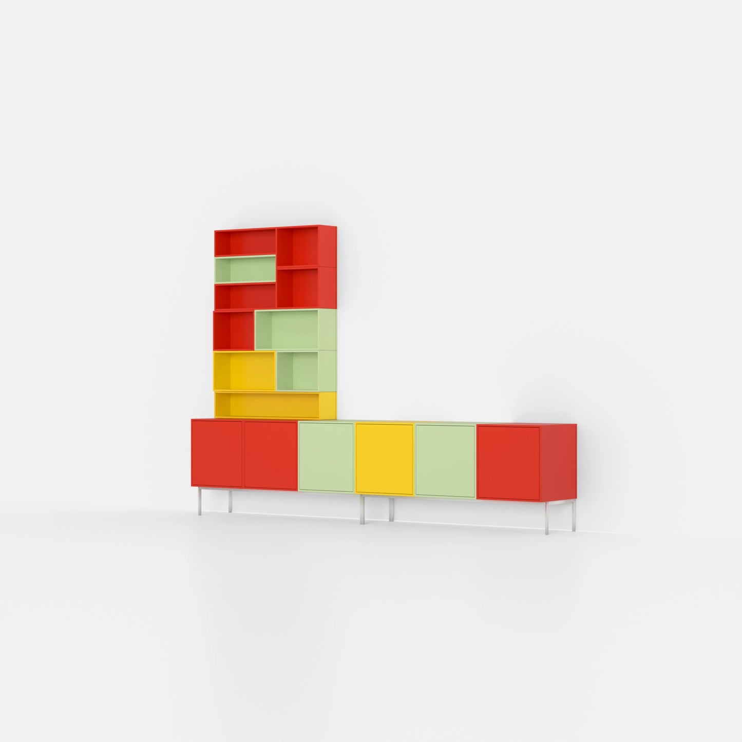 The RK1104 Sideboard transforms your room. It offers 18 modules over a width of 240 cm, a height of 172 cm and a depth of 37 cm. Do you need more storage space? You'll find it here. The vibrant colors - white, coral red, canary yellow and peppermint light - open up stylish design options. White brings brightness, while coral red and canary yellow radiate energy and joy. peppermint light calms and balances. Whether in the living room, bedroom or office - the RK1104 Sideboard is flexible and strong. Choose it for function and style to make your room unique.