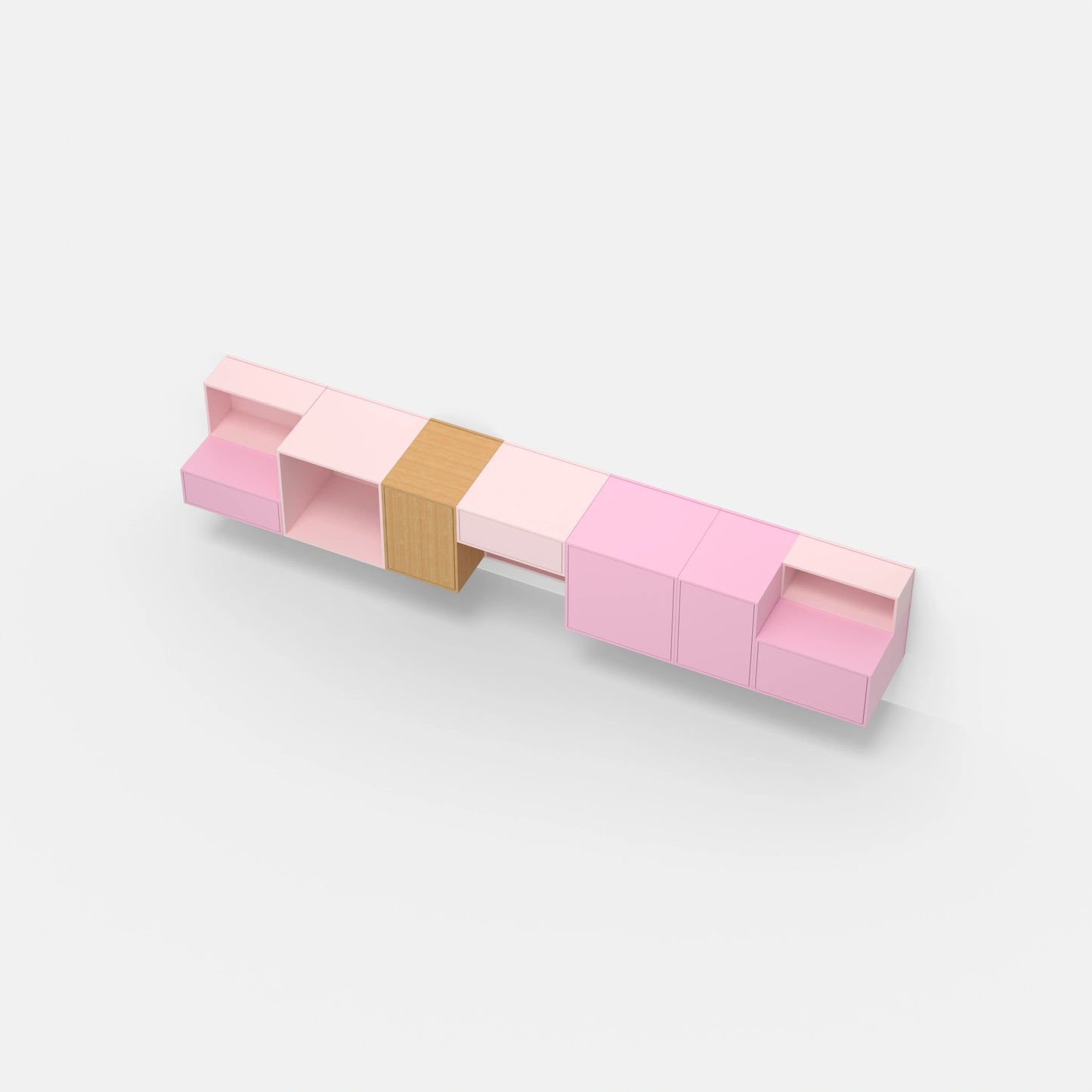 Shelving structure with various Cubit modules in pink and natural tones, combined with door modules and open modules