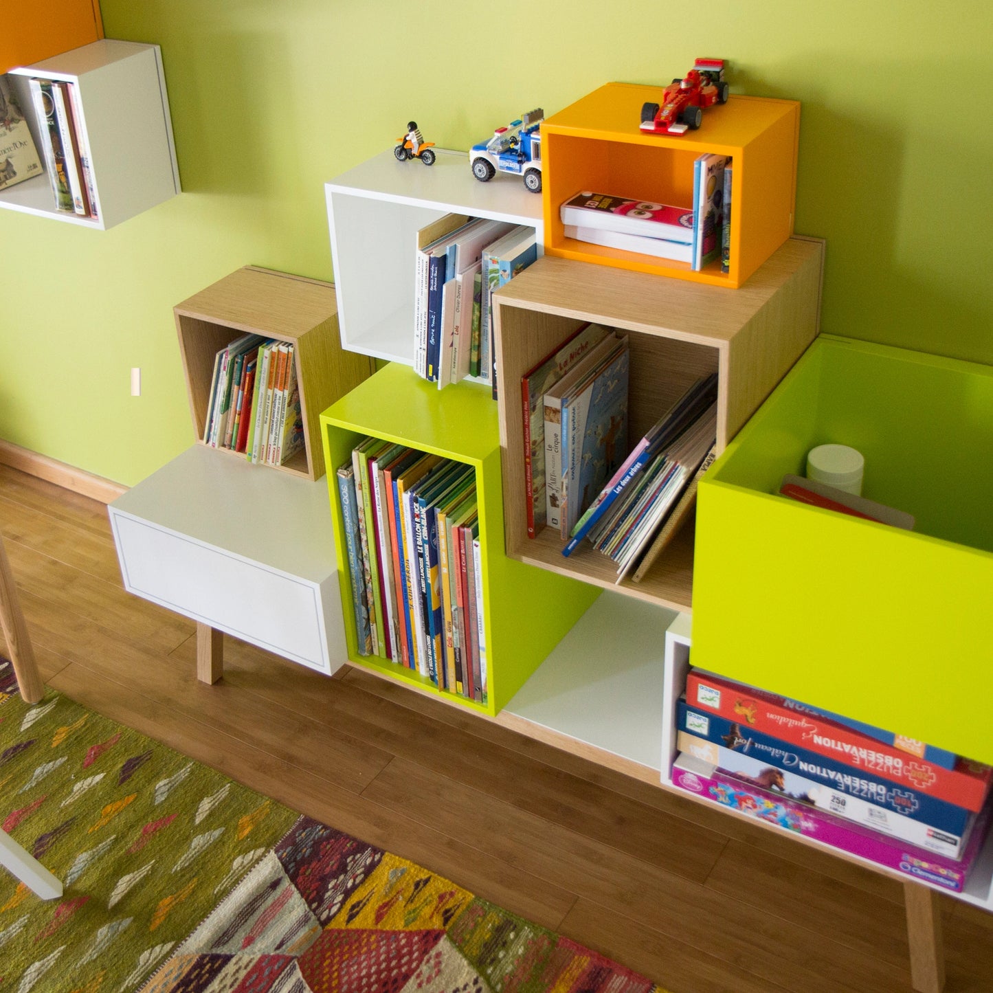 Cubit Wall bookshelf made of coloured modules in shades of red, pink and yellow, dynamically arranged for a lively room design