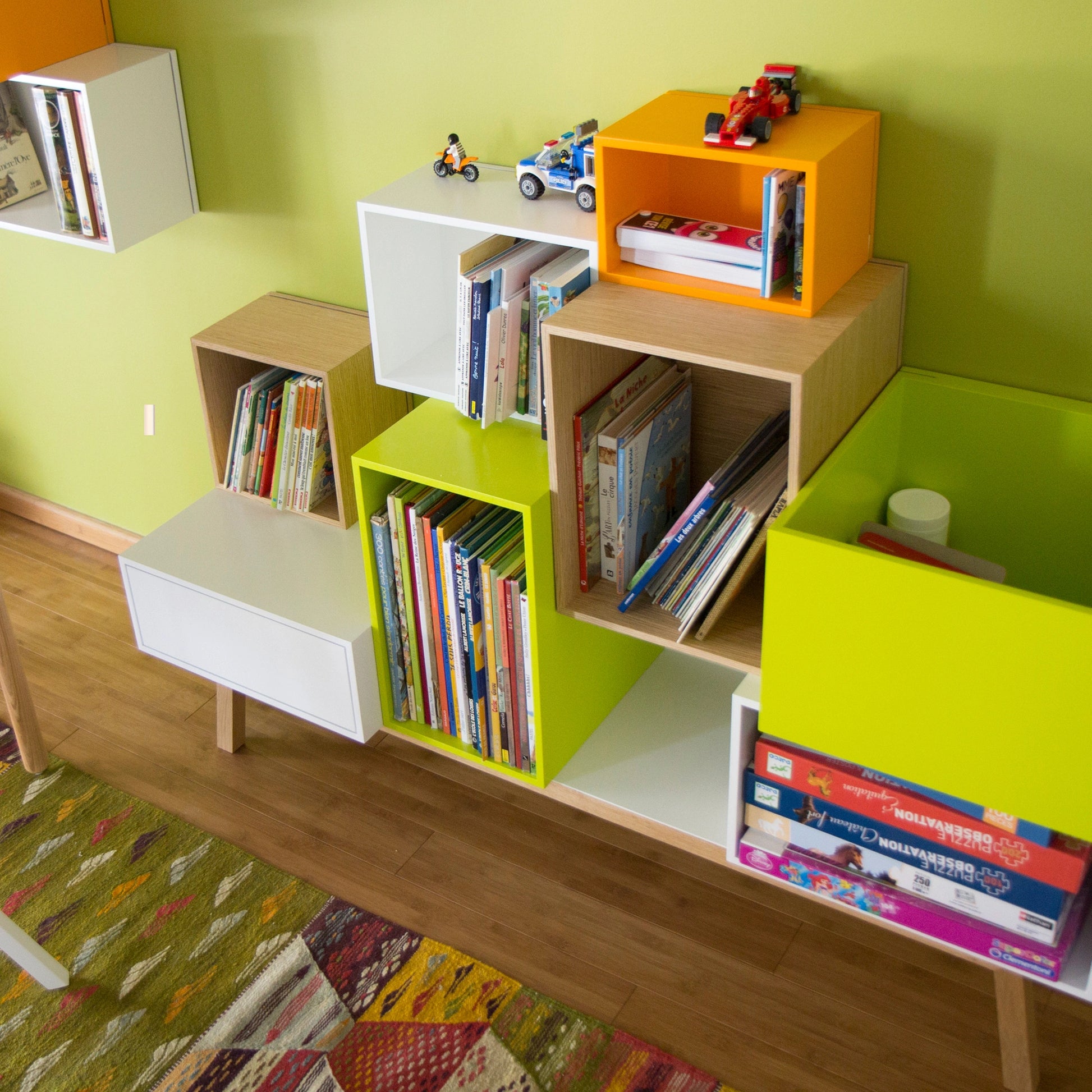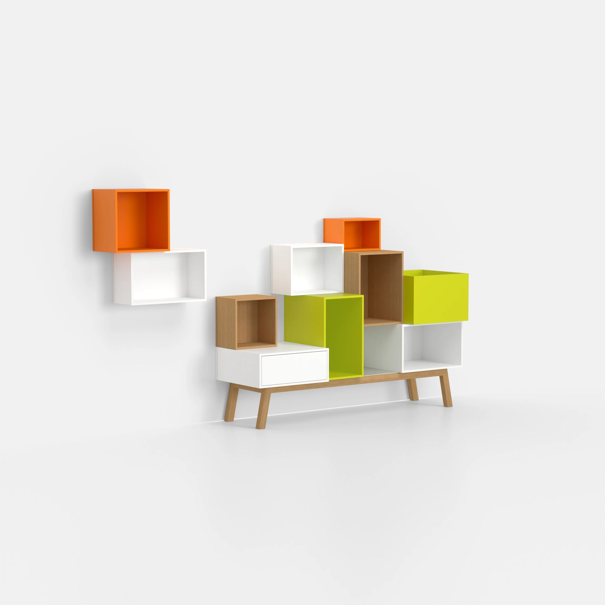 Three modular Cubit shelf boxes, two in light green and one in walnut veneer, arranged freely on the floor, another on a black metal frame
