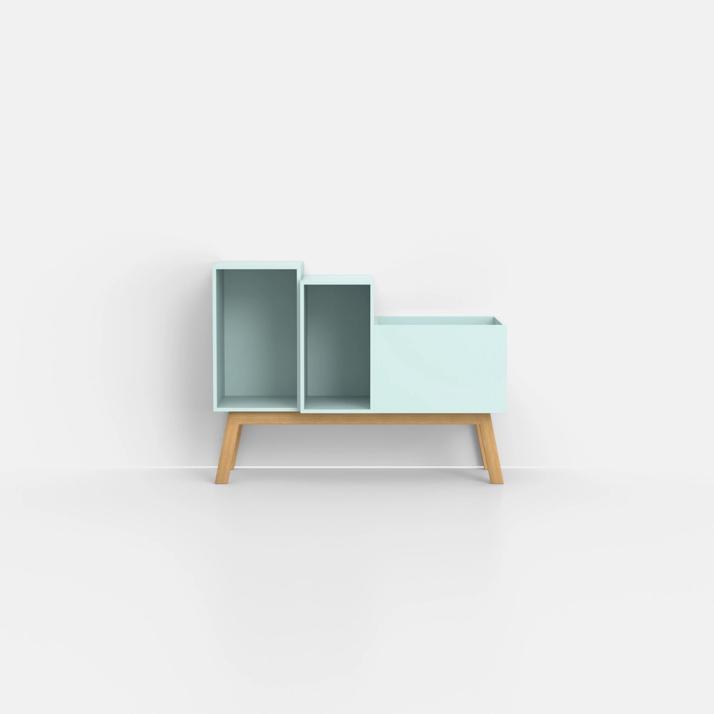Three modular Cubit shelf boxes, two in light green and one in walnut veneer, arranged freely on the floor, another on a black metal frame
