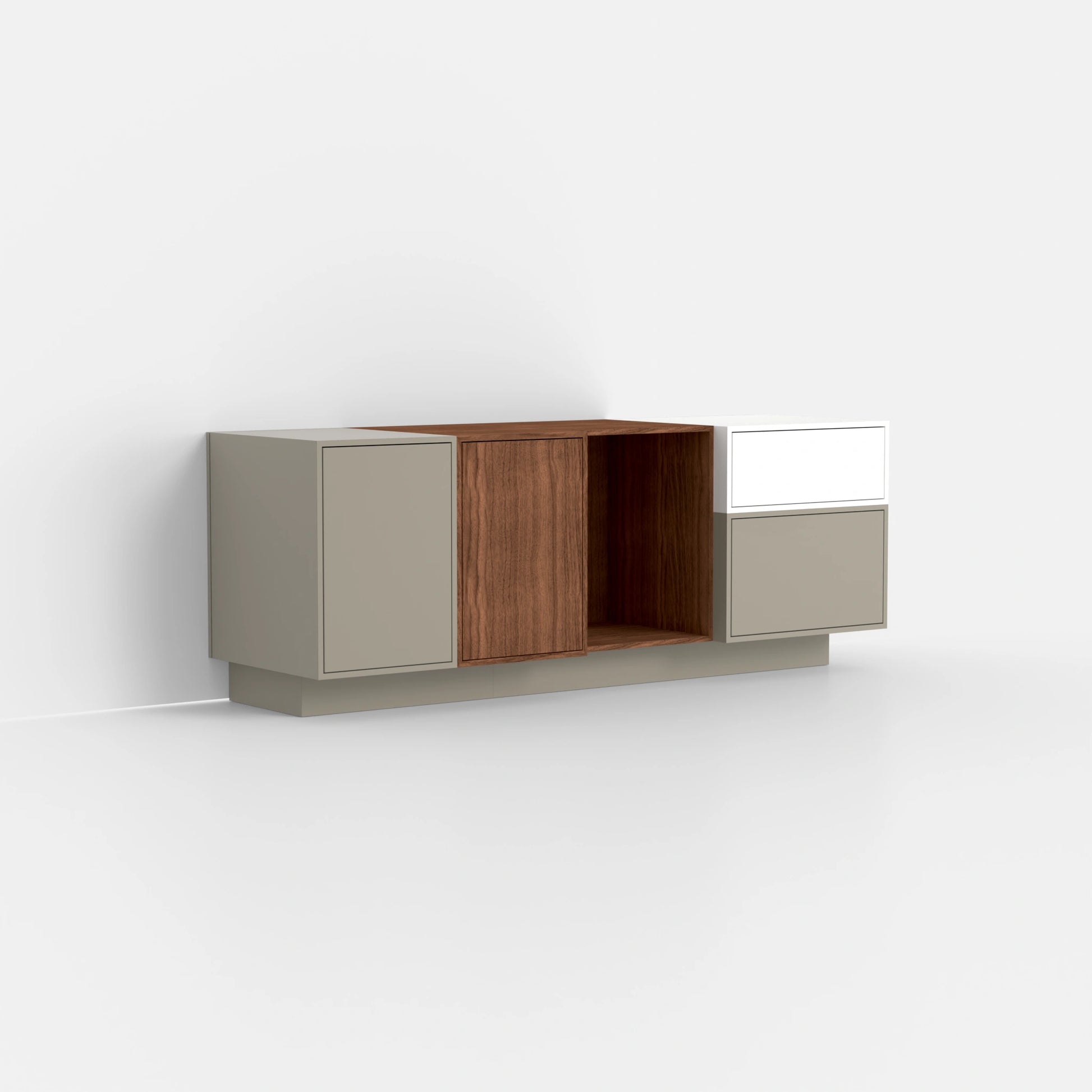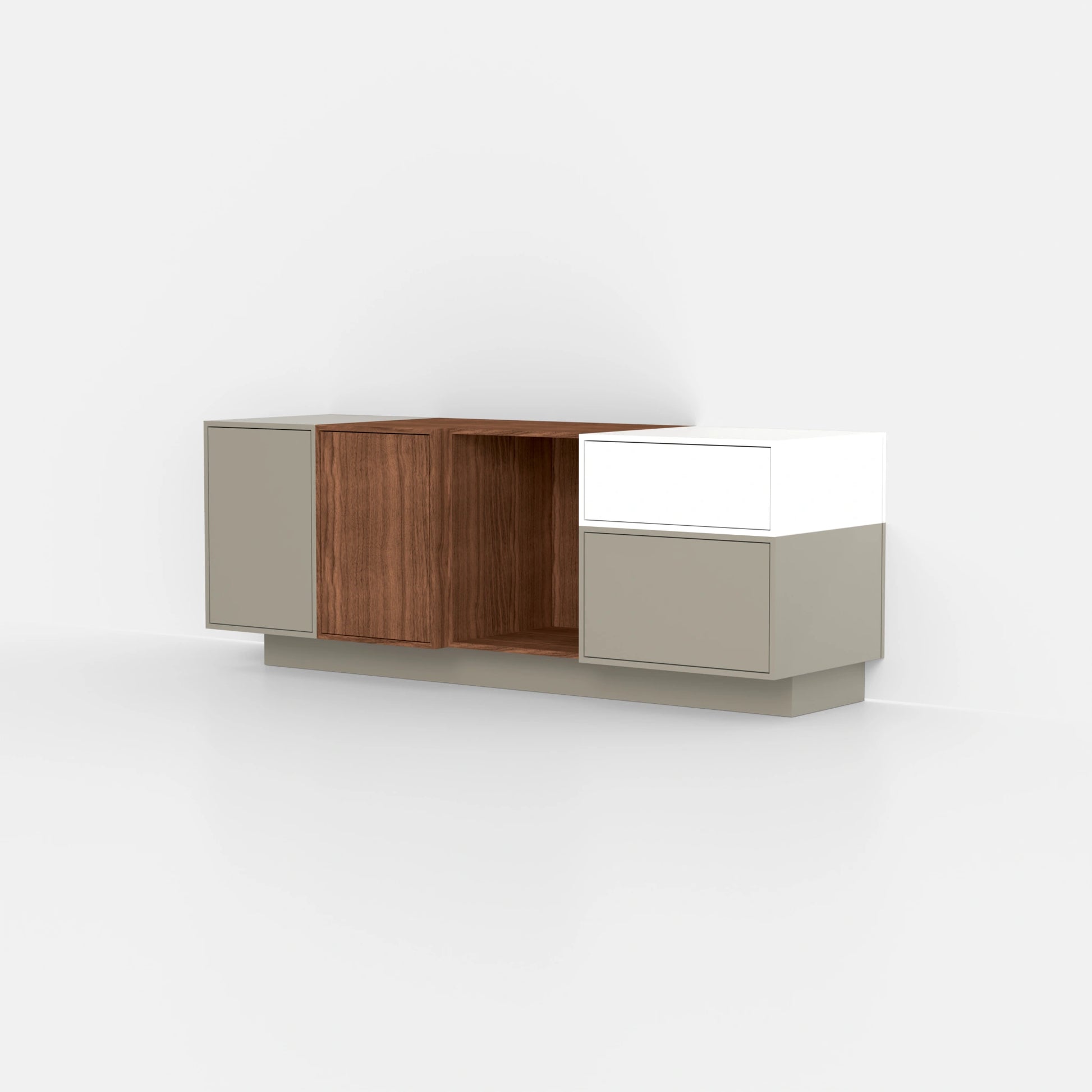 The SB036 Sideboard enhances any modern living space. With a width of 128 cm, height of 48 cm and depth of 37 cm, it maximizes storage space in seven spacious modules. Its design integrates fango grey light, bright white and warm walnut tones. A combination that is versatile and complements numerous furnishing styles.