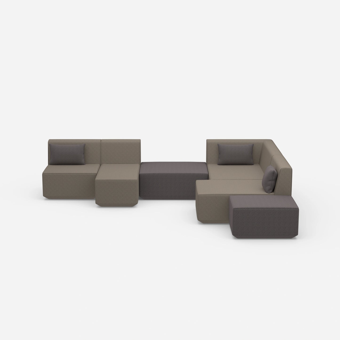 The Sofa lounge with corner transforms any room into an oasis of well-being. This Sofa lounge consists of six flexible modules. Three backrest modules, two pouf modules and a right corner module form the basis. Three cushions round off the ensemble. The modular structure enables versatile arrangements. Perfect for open and compact spaces.