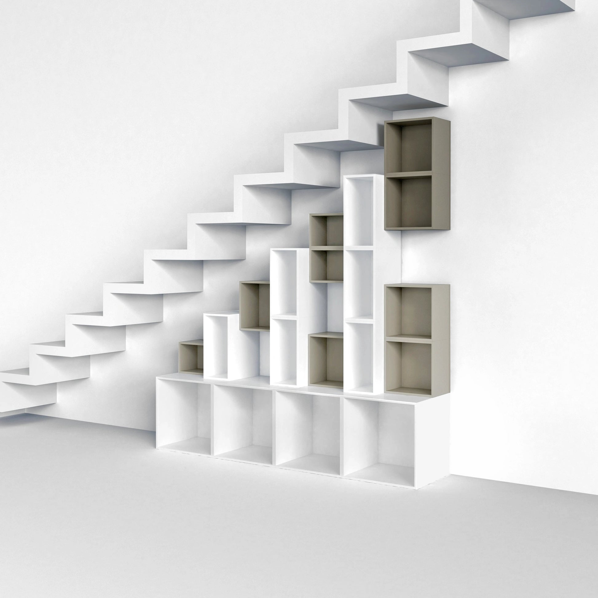 The RK102 Staircase shelving maximizes every corner of the room with its clear design and functionality. 144 cm wide, 156 cm high, 33 cm deep - perfect for living rooms, studies or bedrooms. You can choose between fango grey light and white. Both options offer modern and versatile color tones.