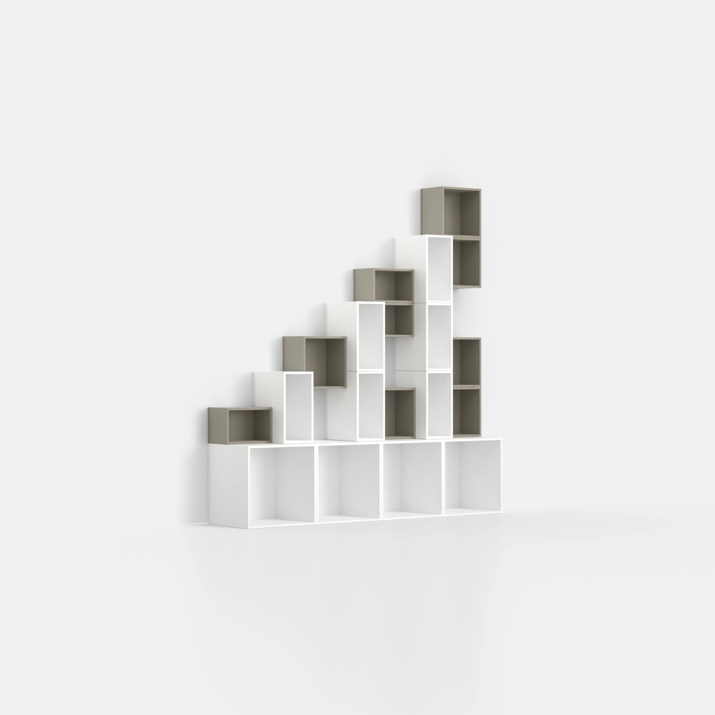 Flexibility is guaranteed thanks to 19 modules. Books, decorations or plants find their place. The choice of colors between subtle grey and pure white allows for creative design. What accents would you like to set?