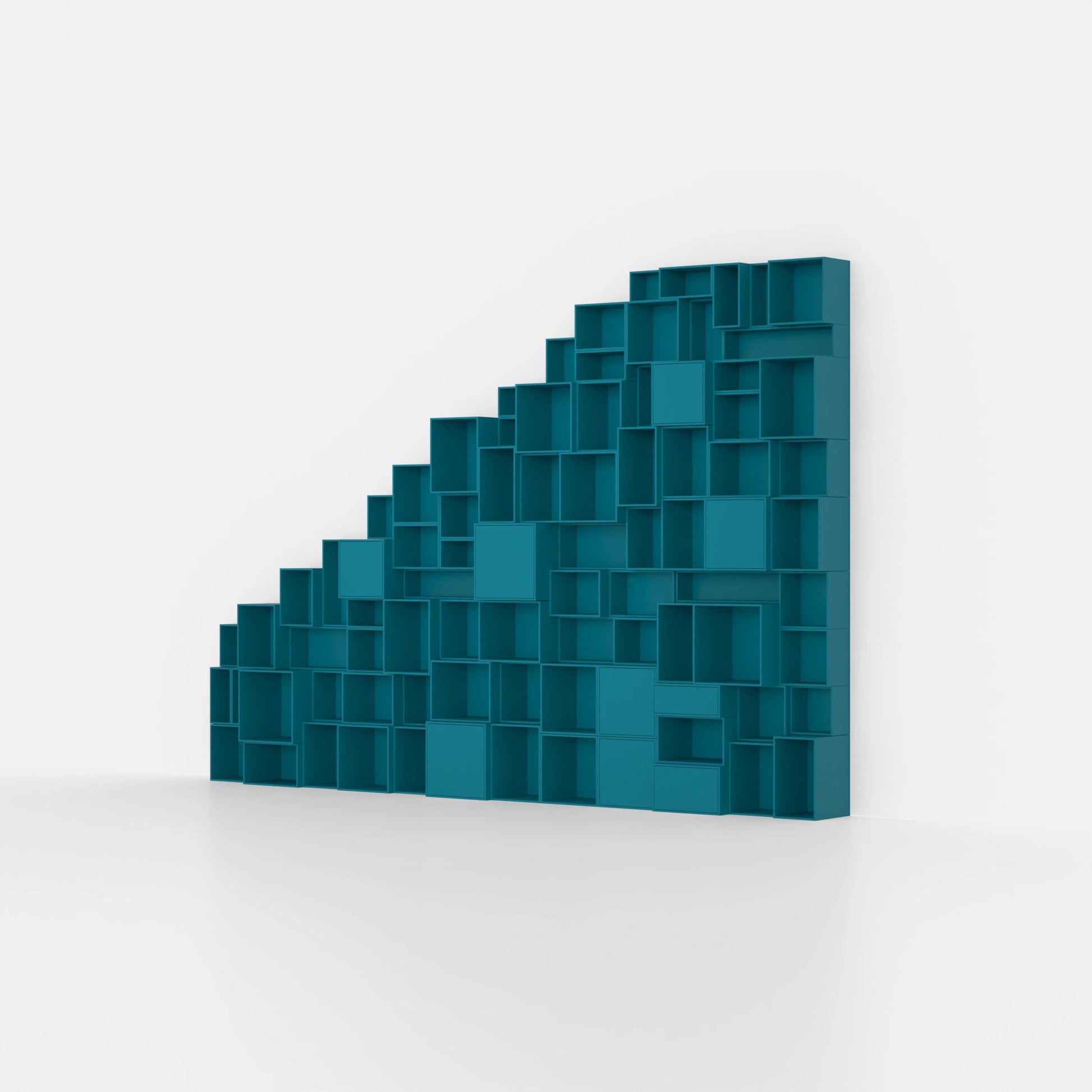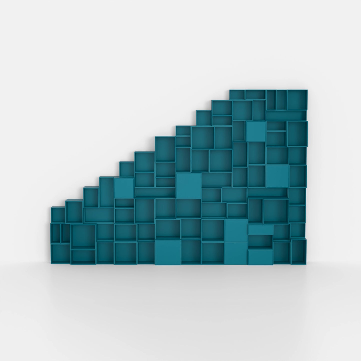 The Staircase shelving RK1180 transforms your storage. At 401 cm wide, 274 cm high and 37 cm deep, it offers 86 modules for plenty of storage space.