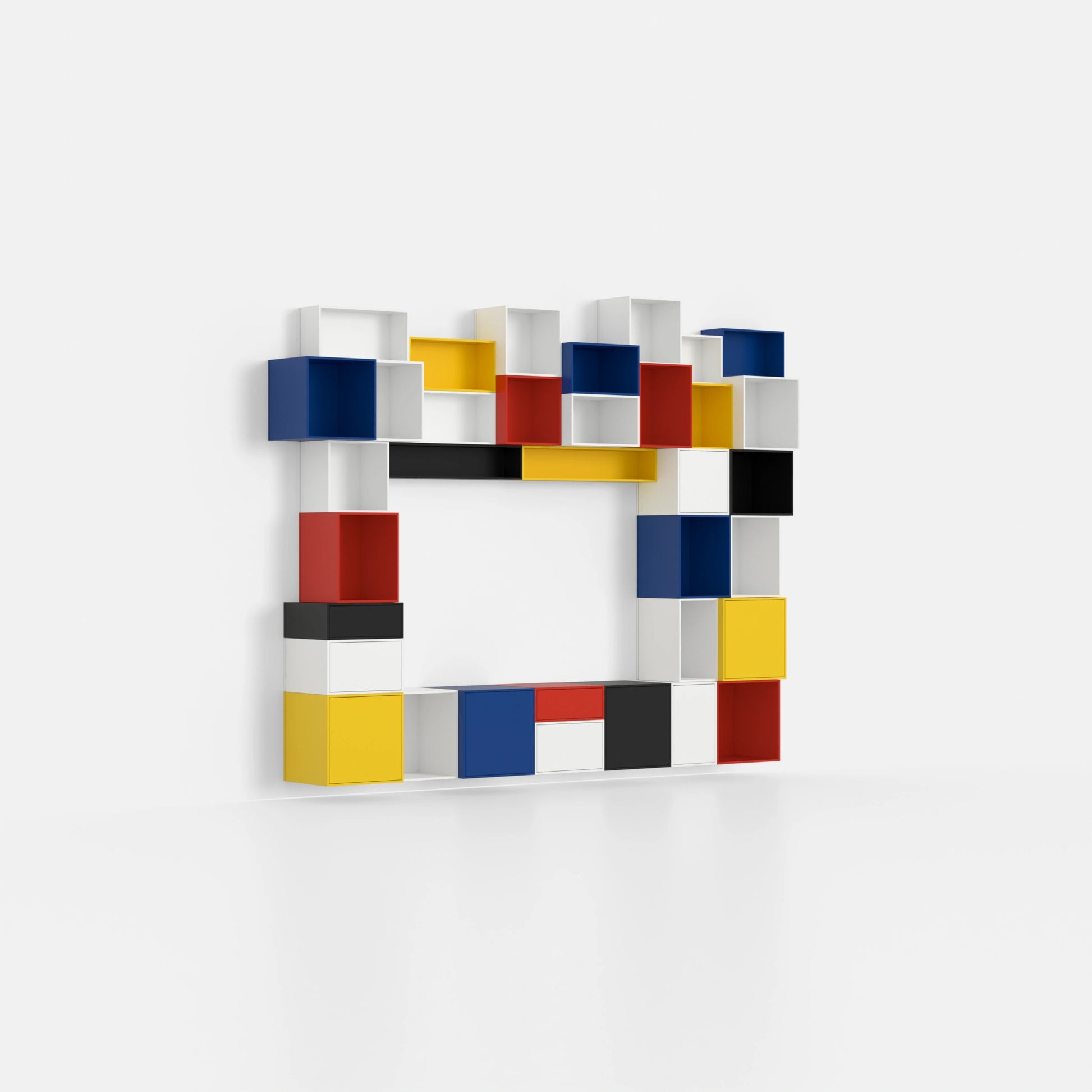 Cubit Wall bookshelf made of coloured modules in shades of red, pink and yellow, dynamically arranged for a lively room design