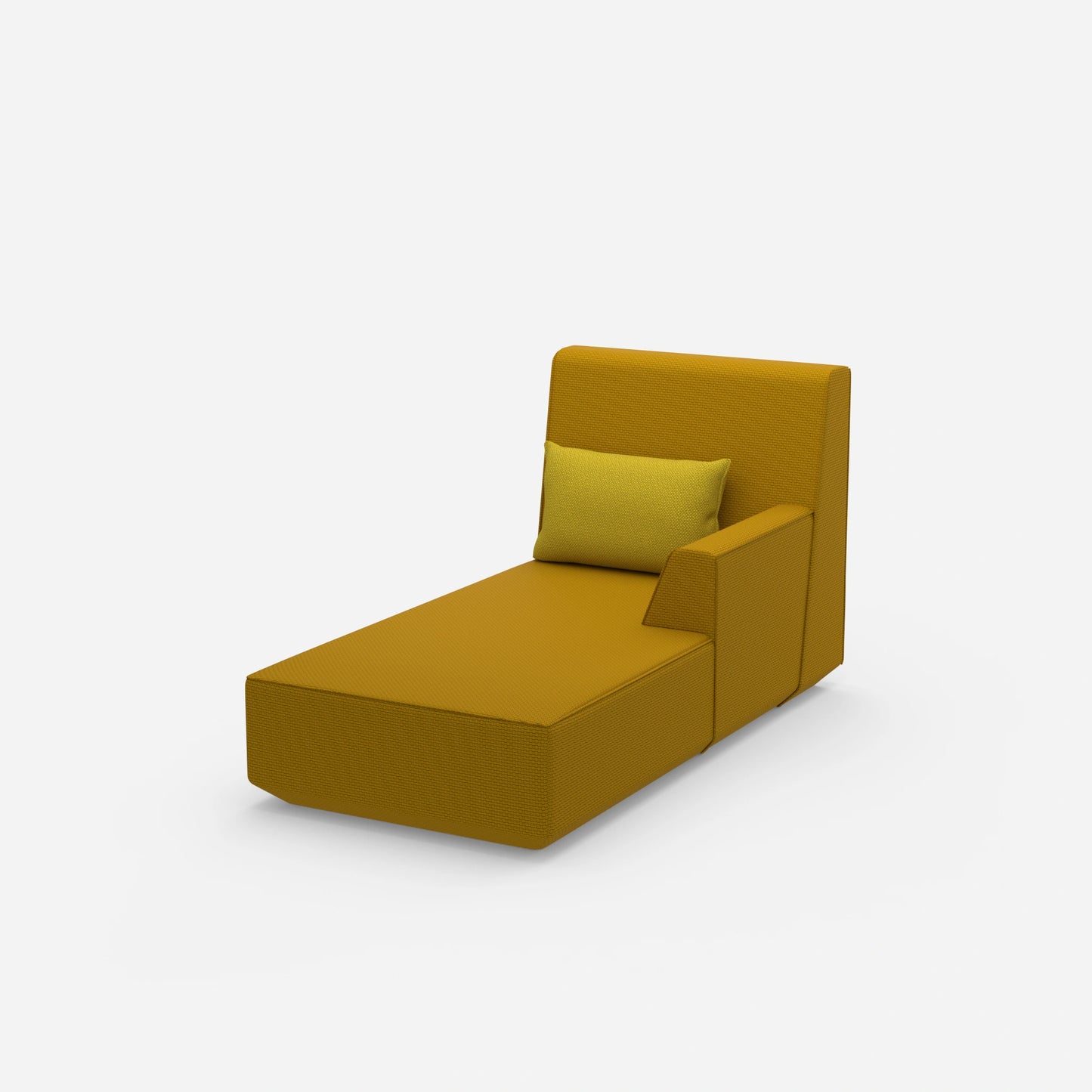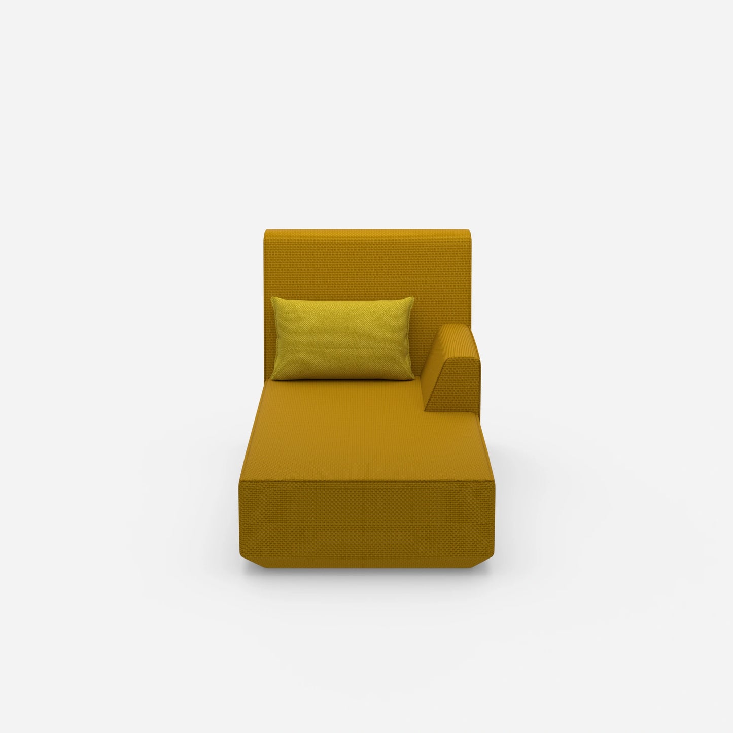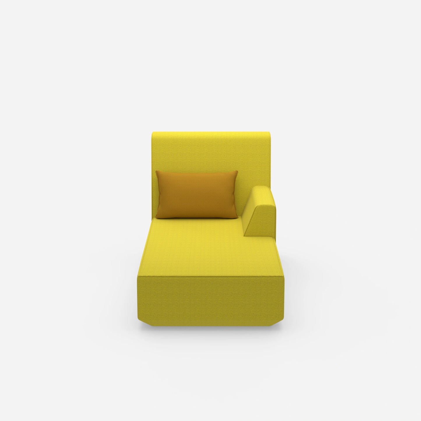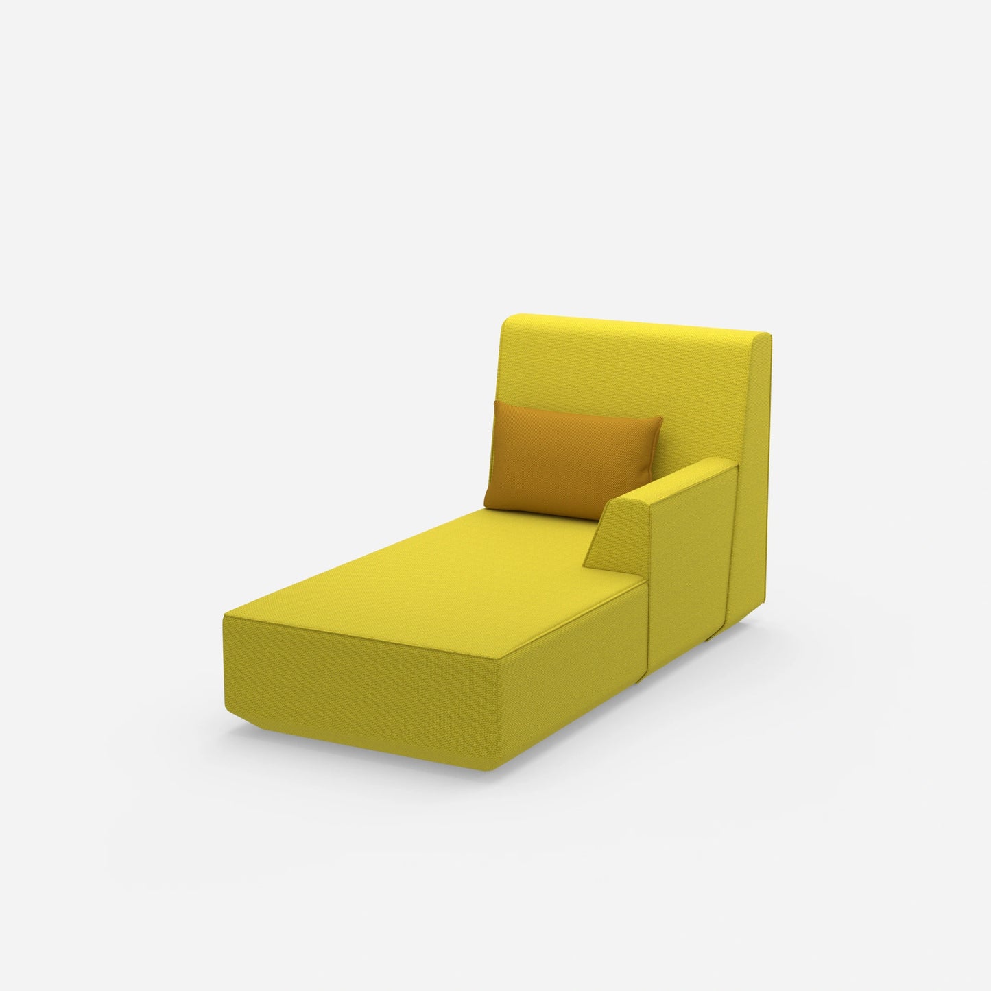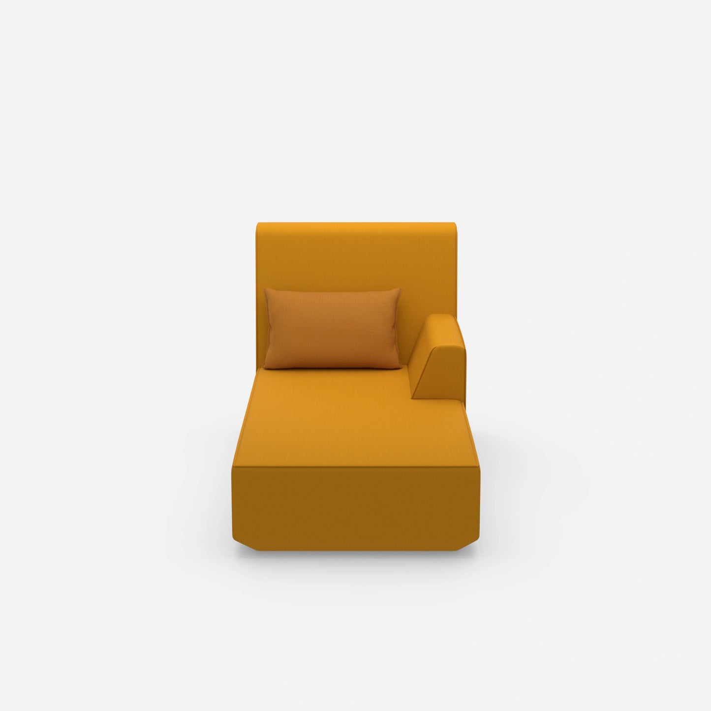 The yellow chaise longue attracts everyone's attention. As part of the versatile daybeds category, it offers a modular design. A right chaise longue module and a colour-coordinated cushion form this unit. Together they appear open, compact and offer countless possibilities.