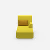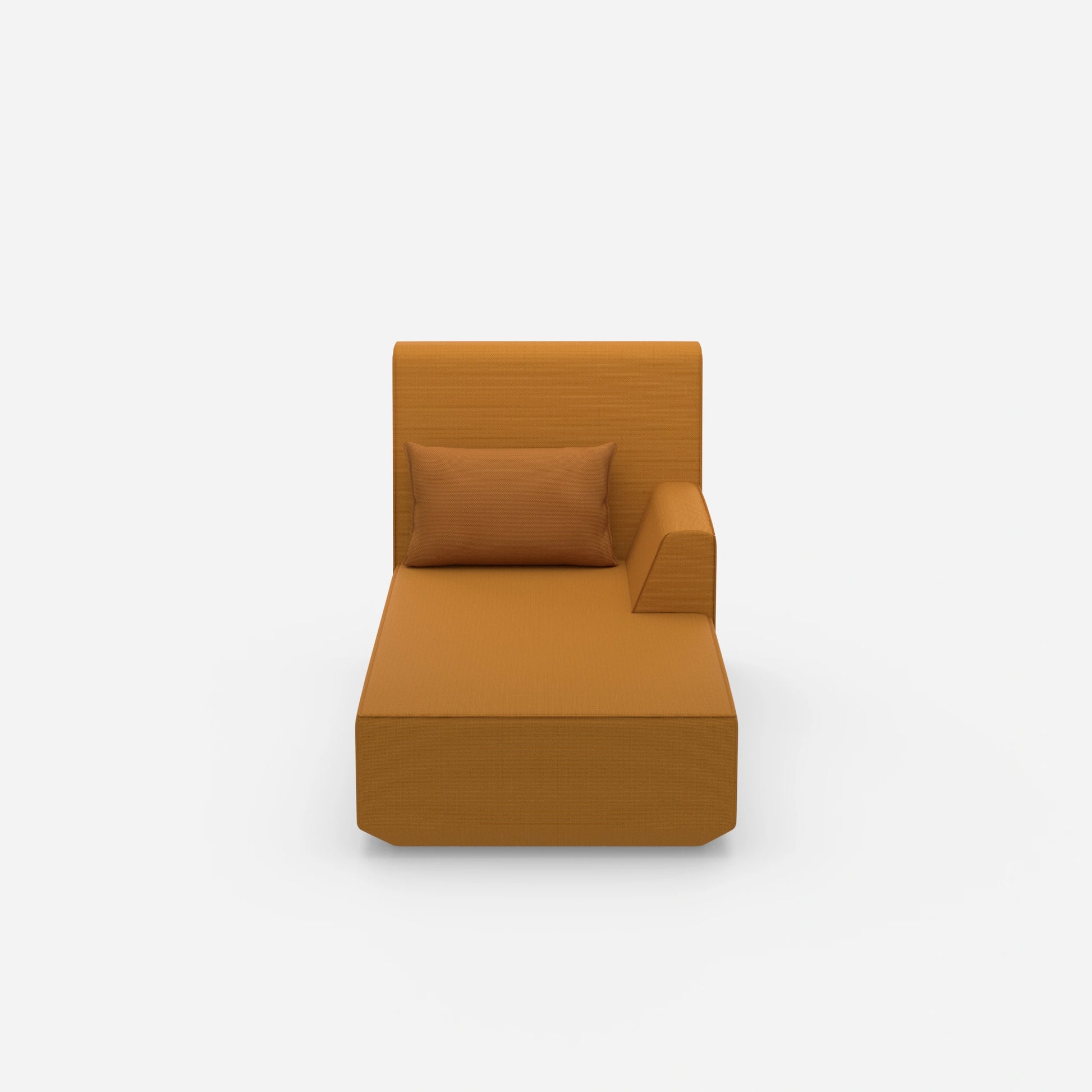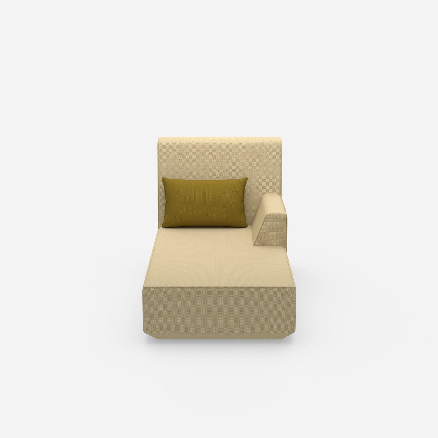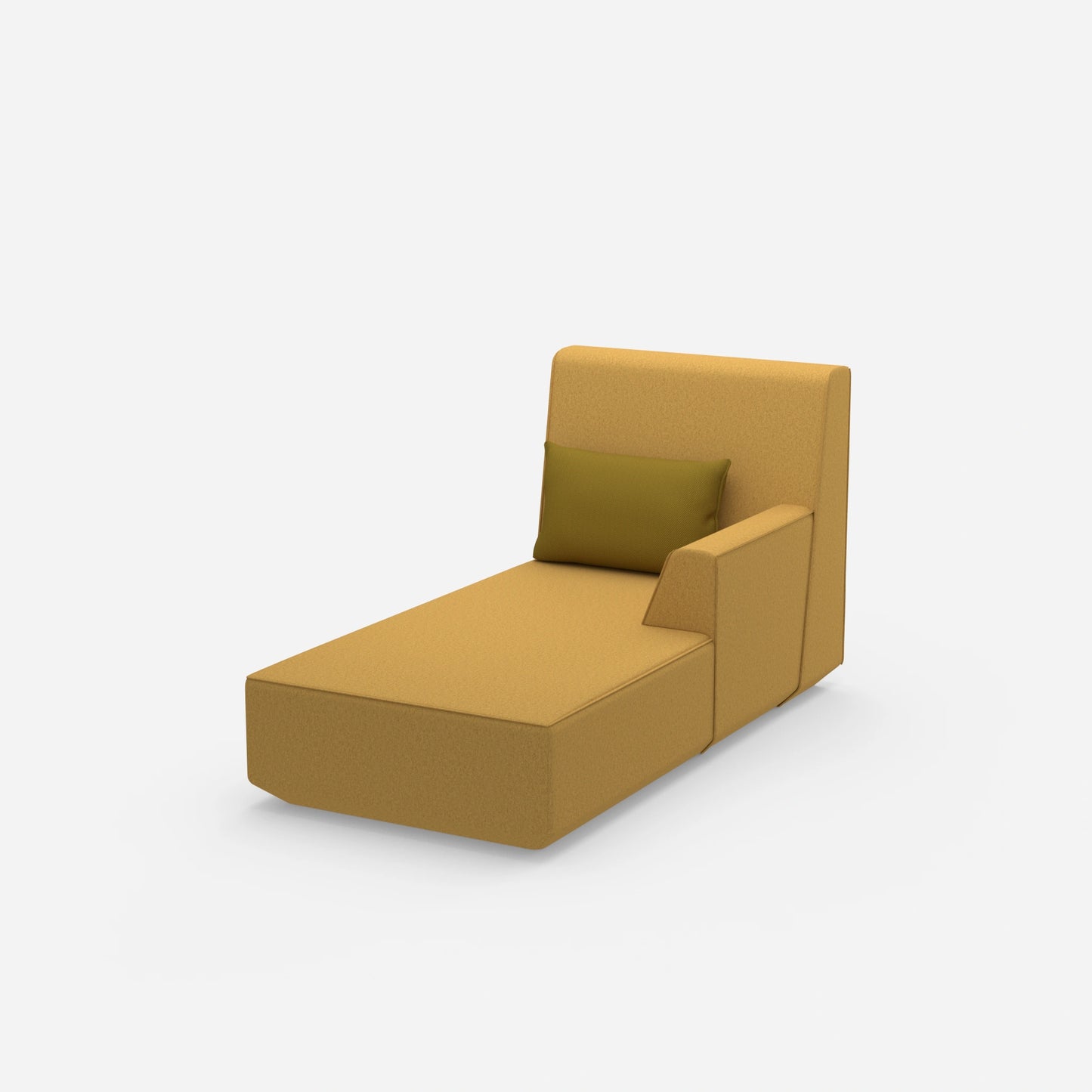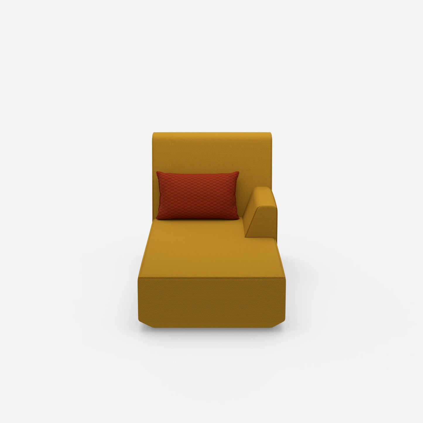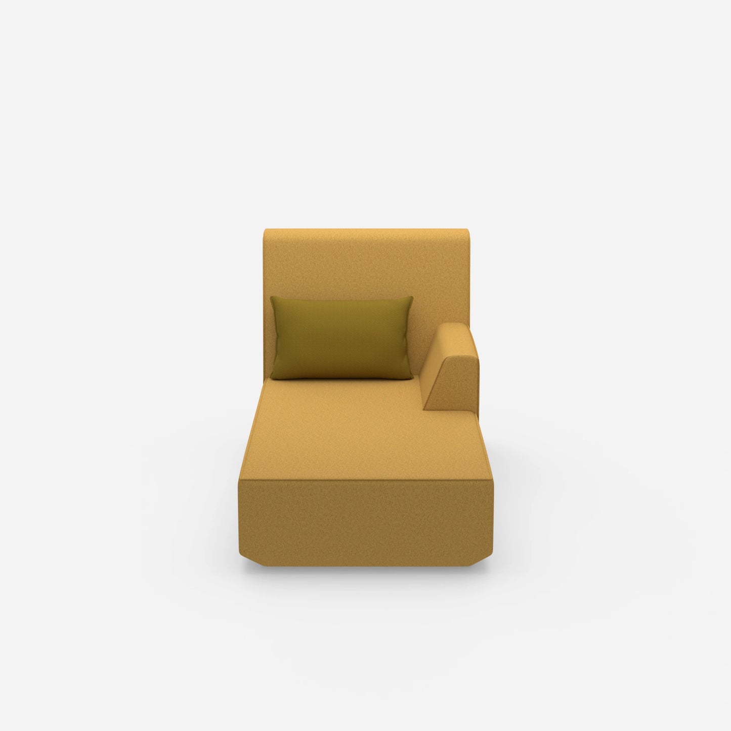 The yellow chaise longue attracts everyone's attention. As part of the versatile daybeds category, it offers a modular design. A right chaise longue module and a colour-coordinated cushion form this unit. Together they appear open, compact and offer countless possibilities.