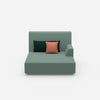 Intérieur d'un Showrooms lumineux avec cheminée et canapés modulaires Cubit dans différentes nuances de vert
