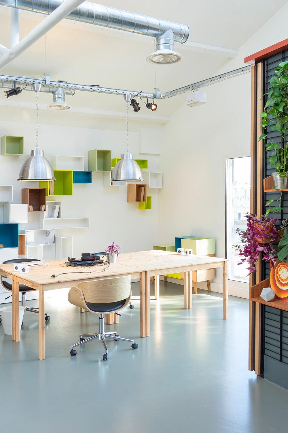 Showroom moderne avec Système d'étagères Cubit de différentes couleurs au mur, tables en bois sobres et plantes dans un environnement d'inspiration industrielle.
