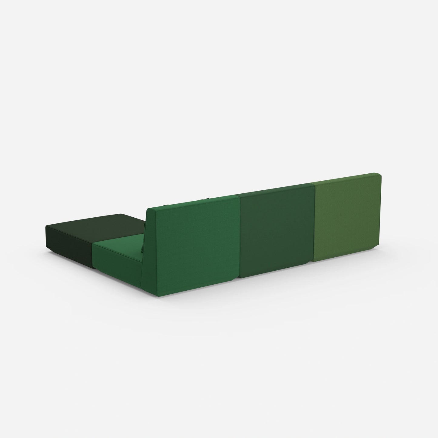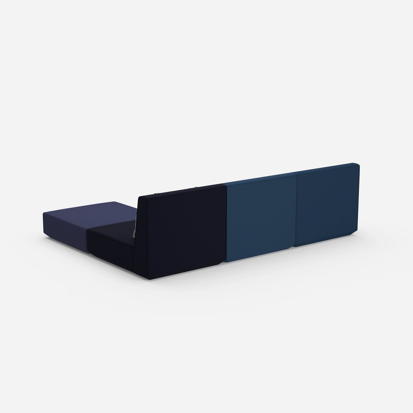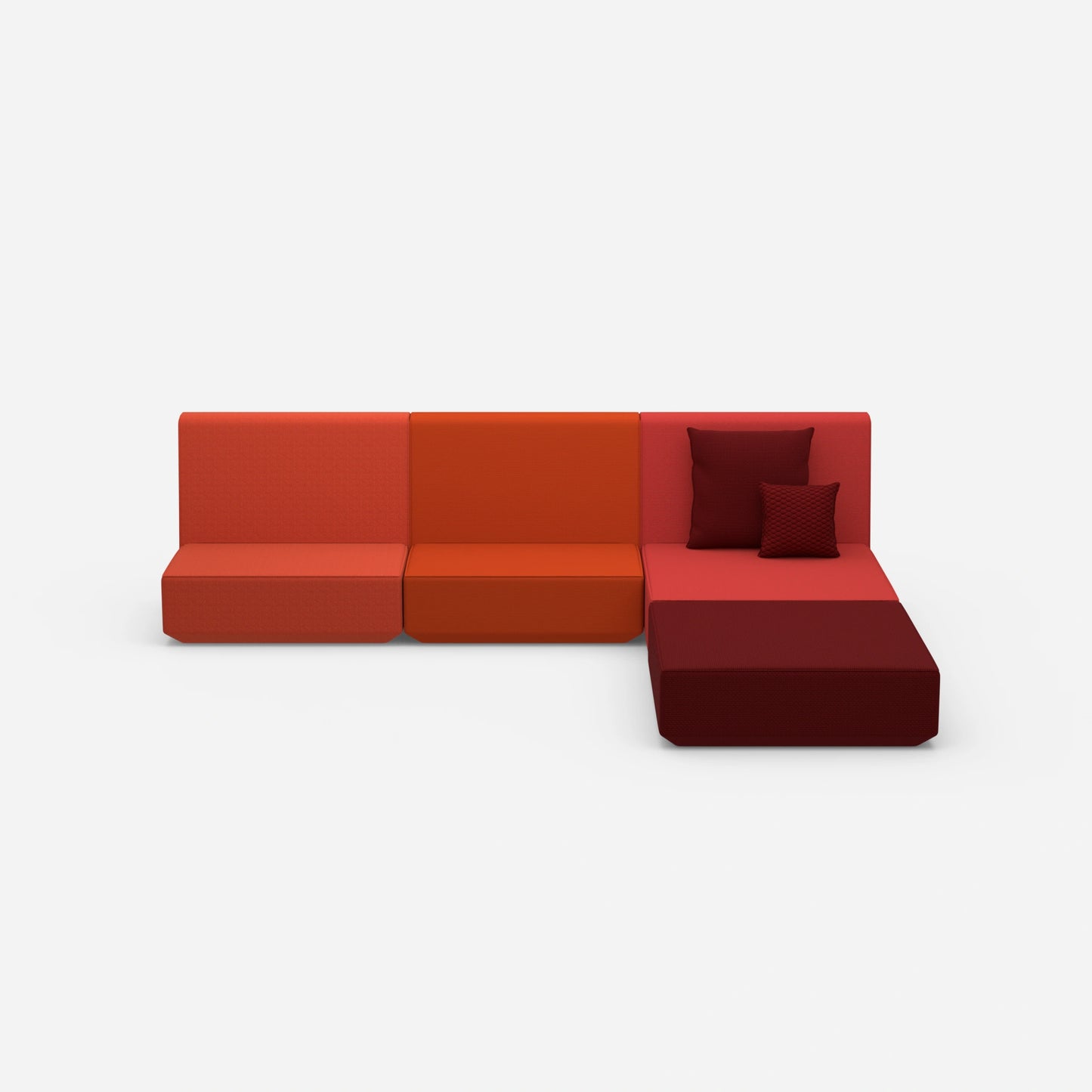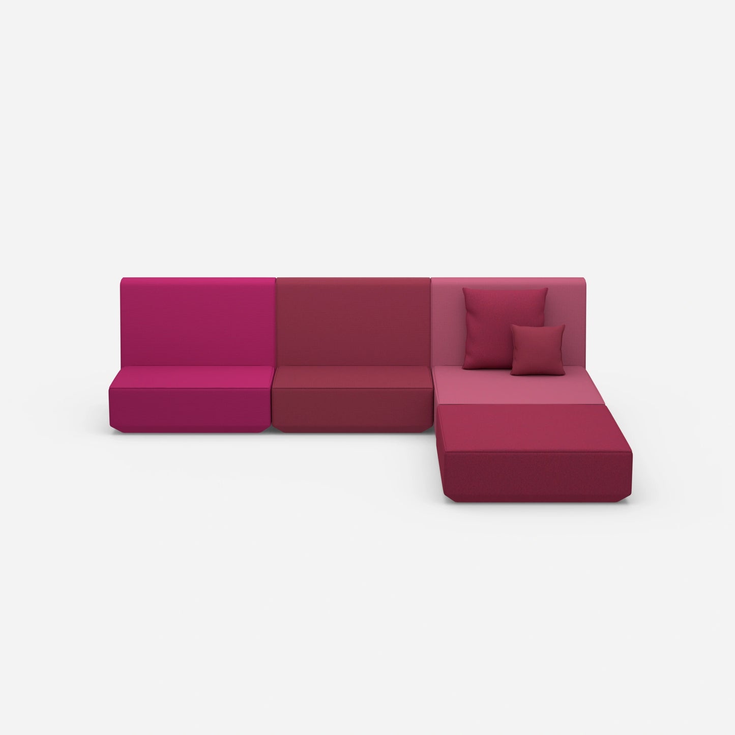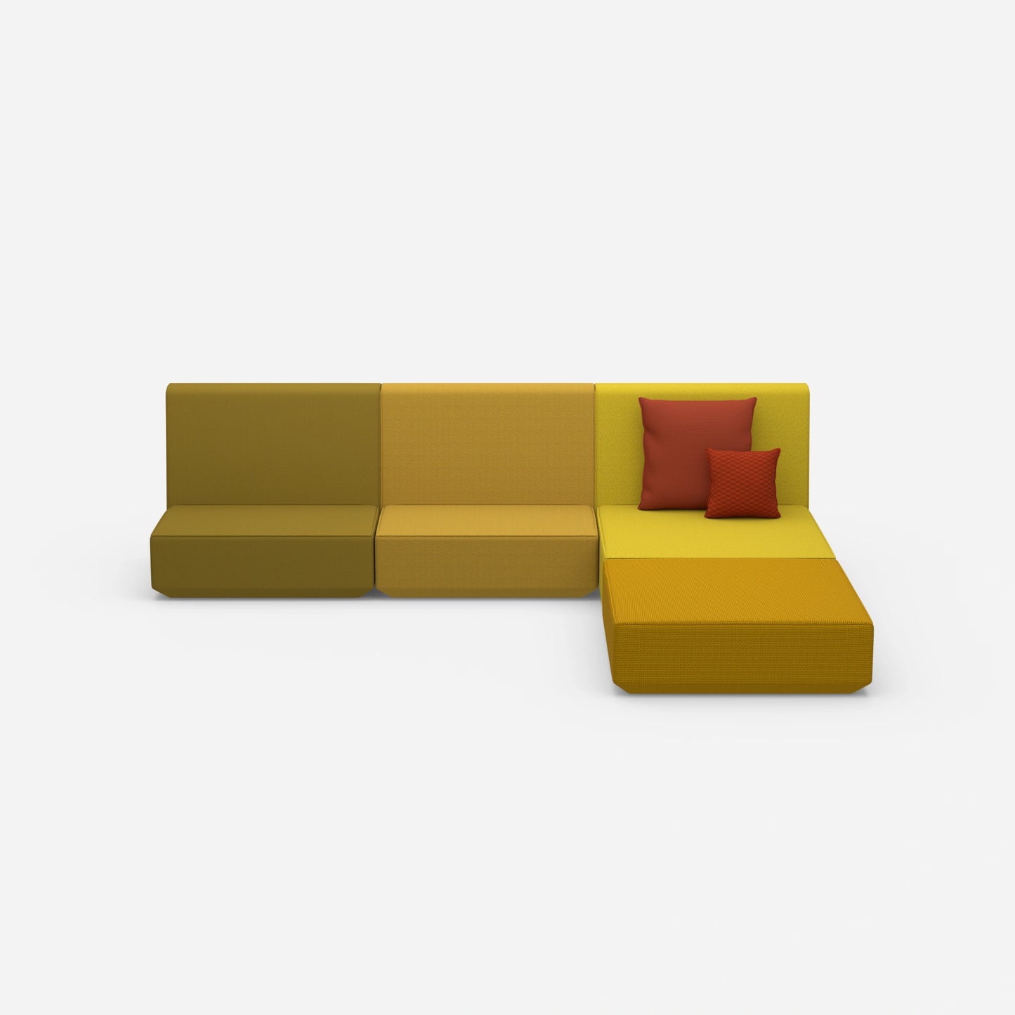 Différents modules de canapés Cubit configurés dans un grand espace ouvert - montre la diversité des combinaisons et des couleurs possibles