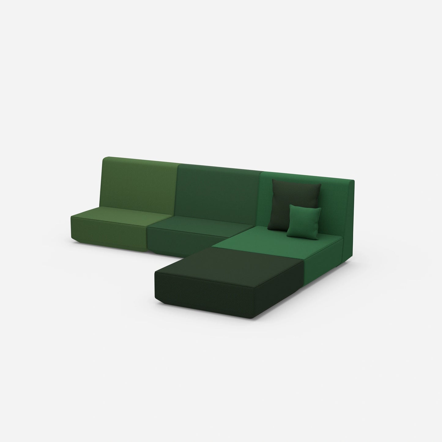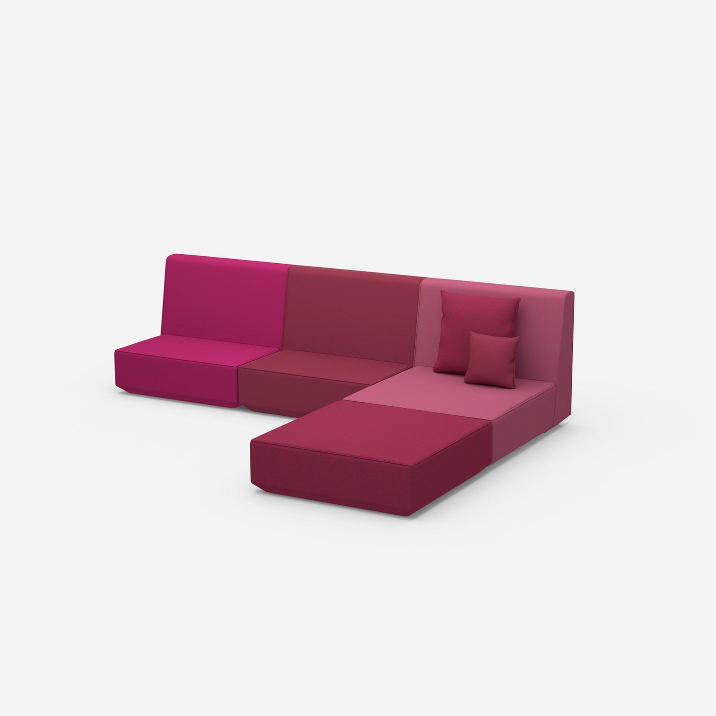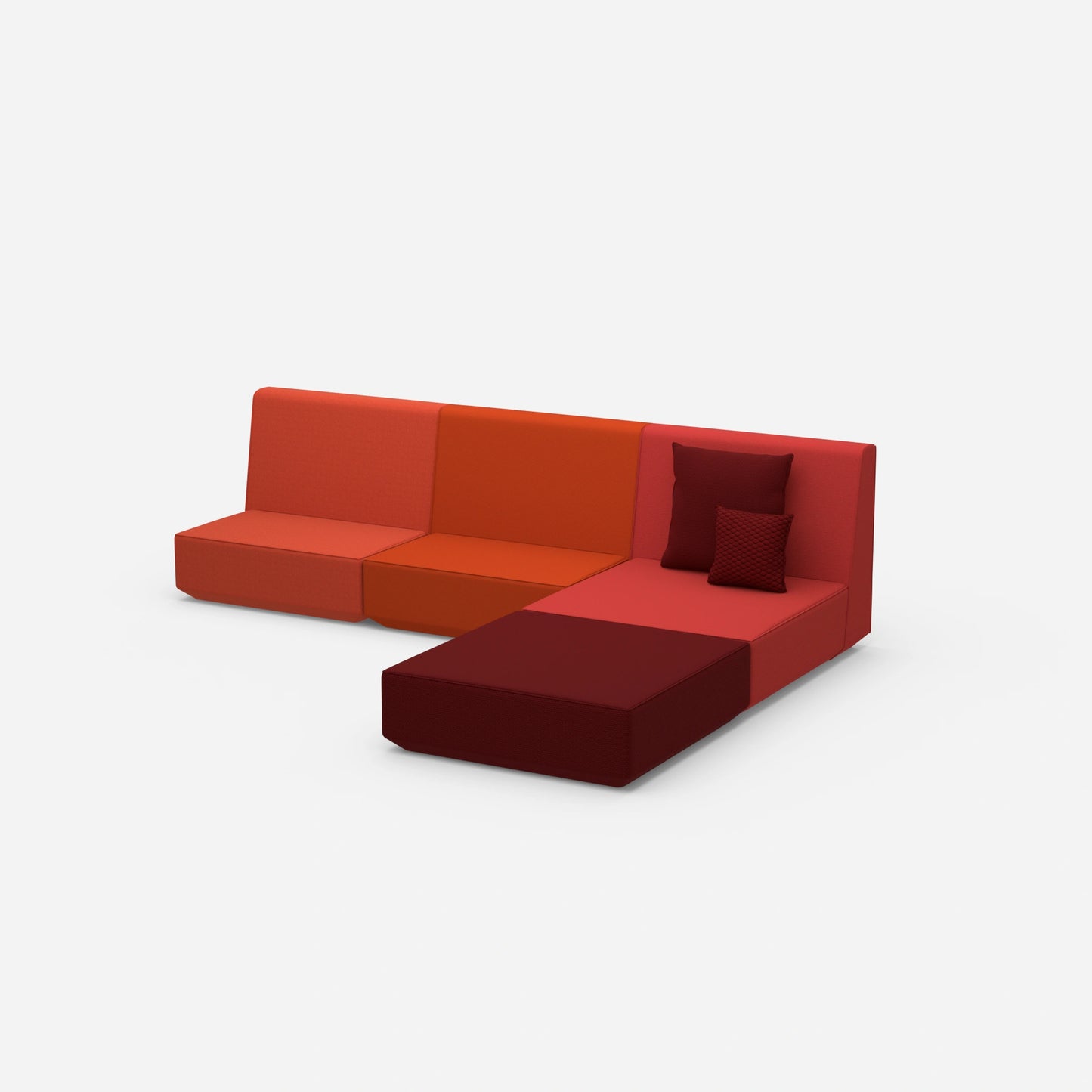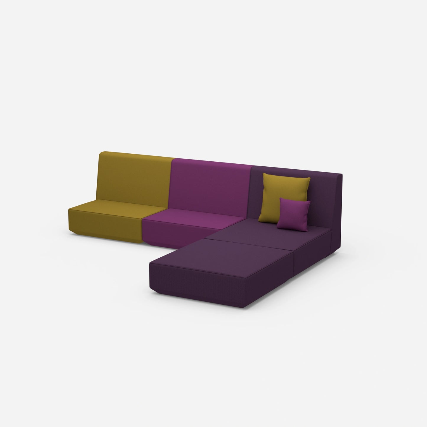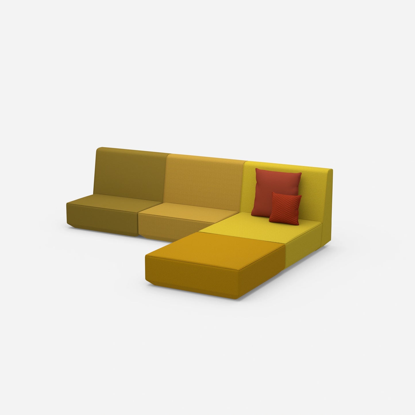 Différents modules de canapés Cubit configurés dans un grand espace ouvert - montre la diversité des combinaisons et des couleurs possibles