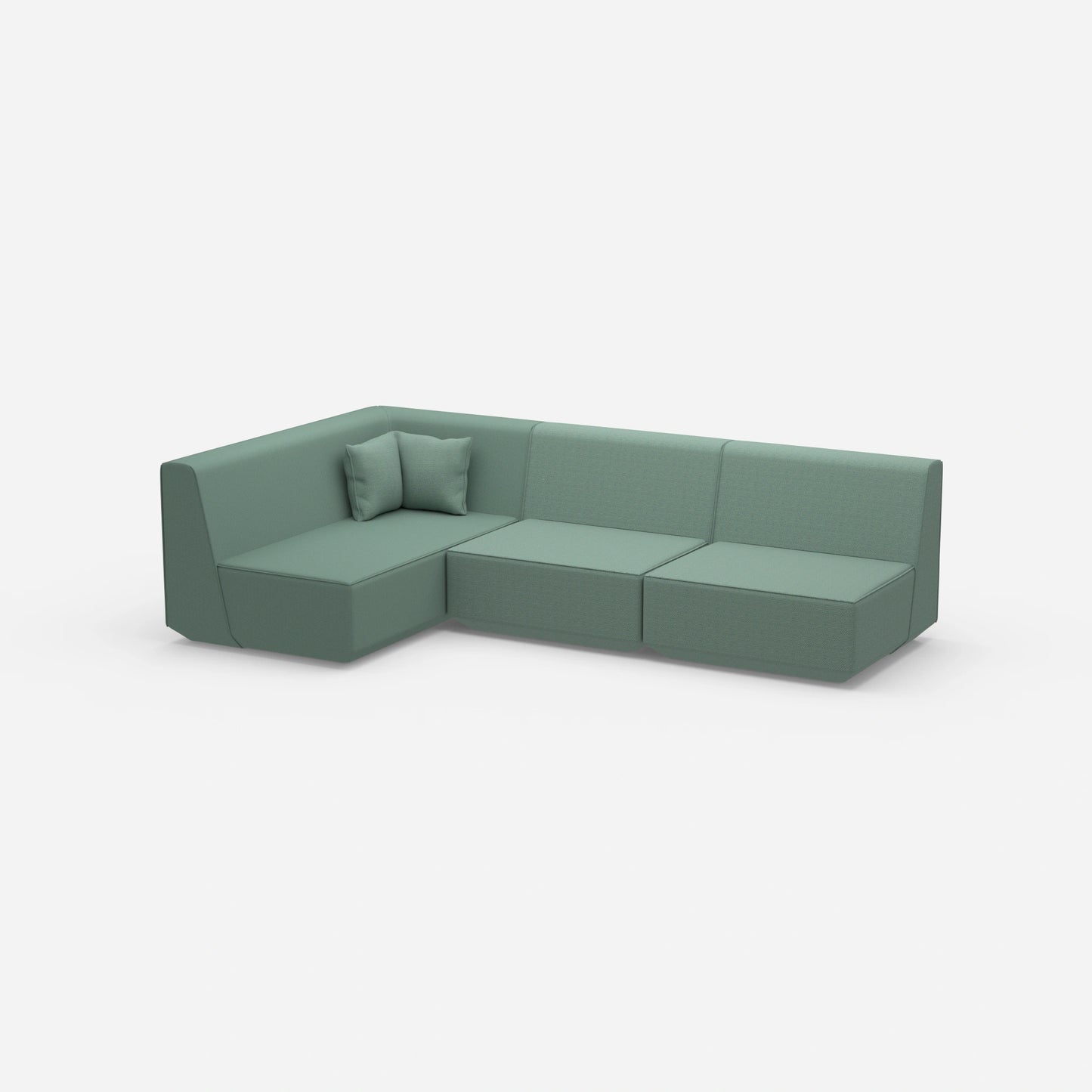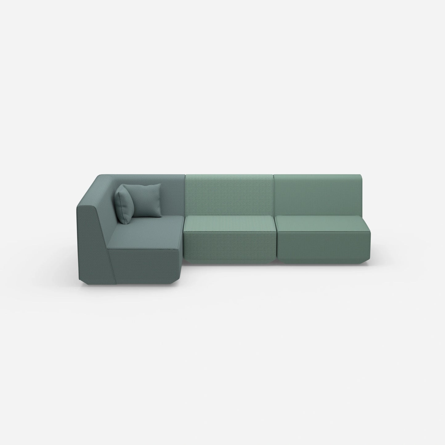 Différents modules de canapés Cubit configurés dans un grand espace ouvert - montre la diversité des combinaisons et des couleurs possibles