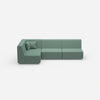 Intérieur d'un Showrooms lumineux avec cheminée et canapés modulaires Cubit dans différentes nuances de vert