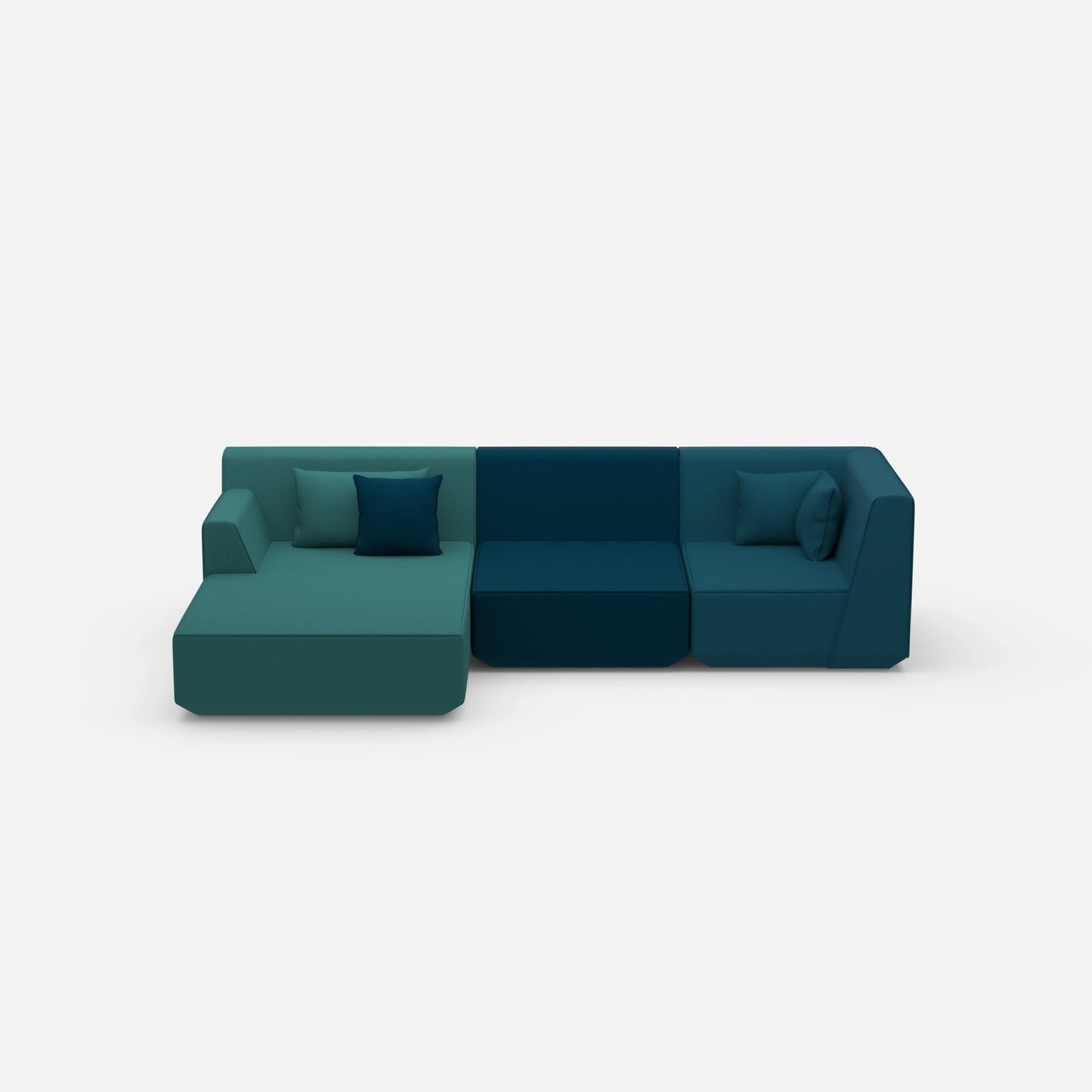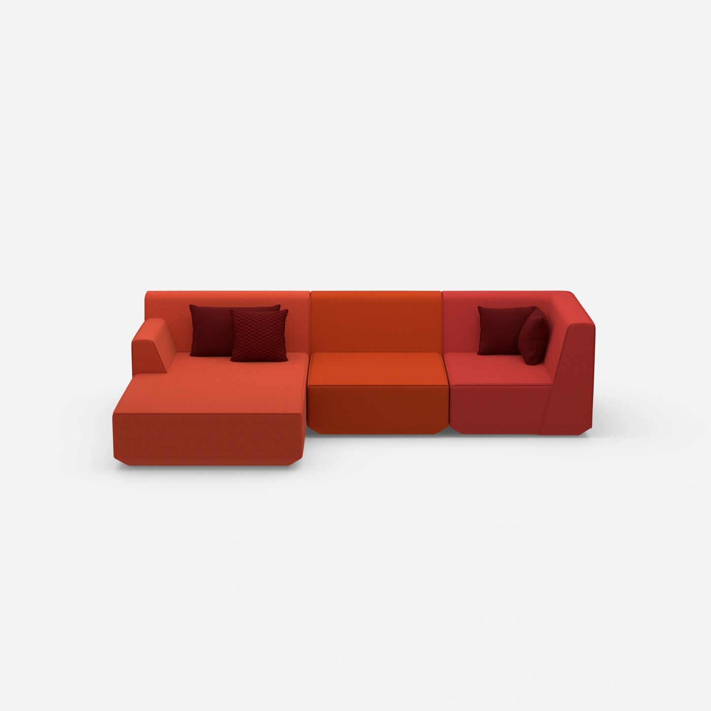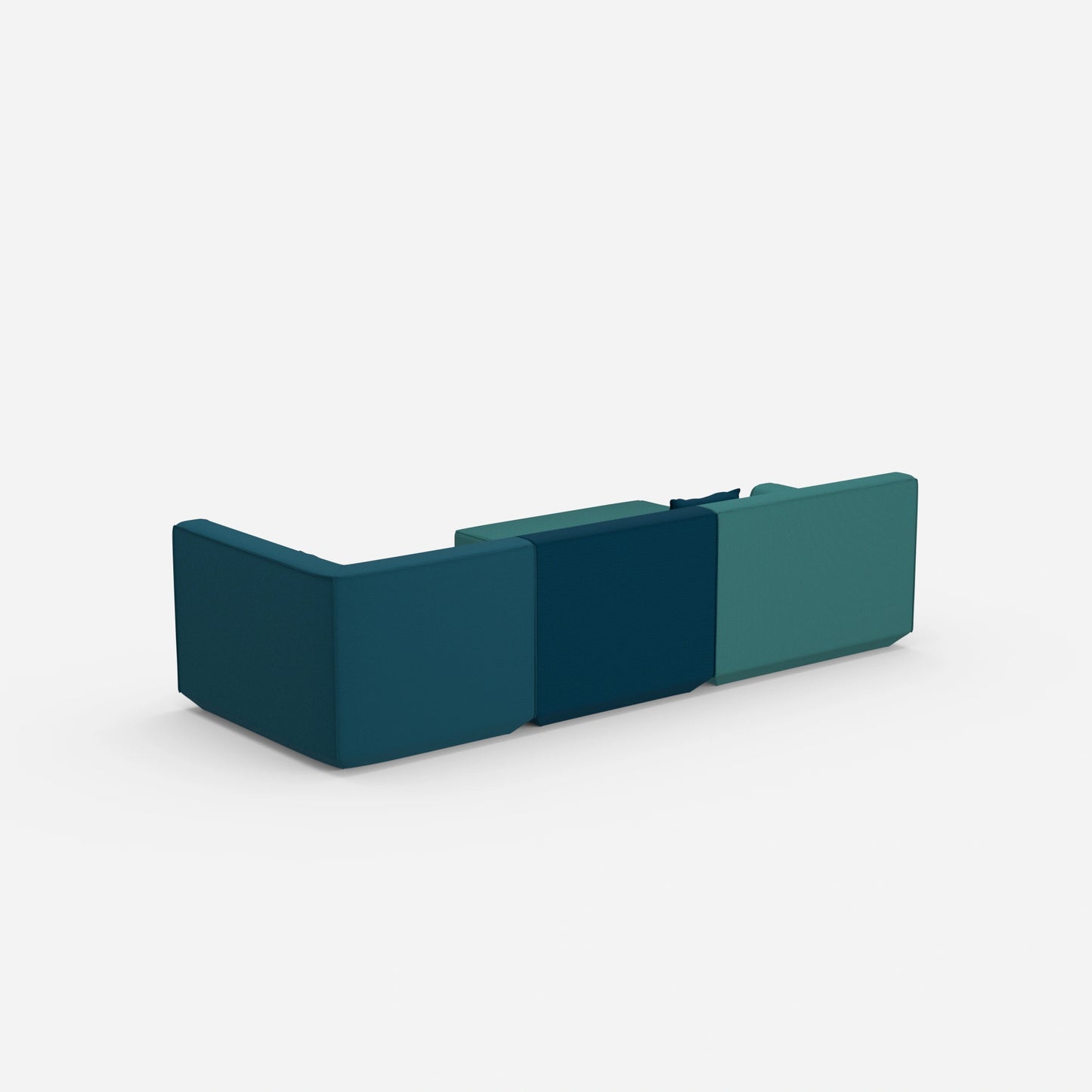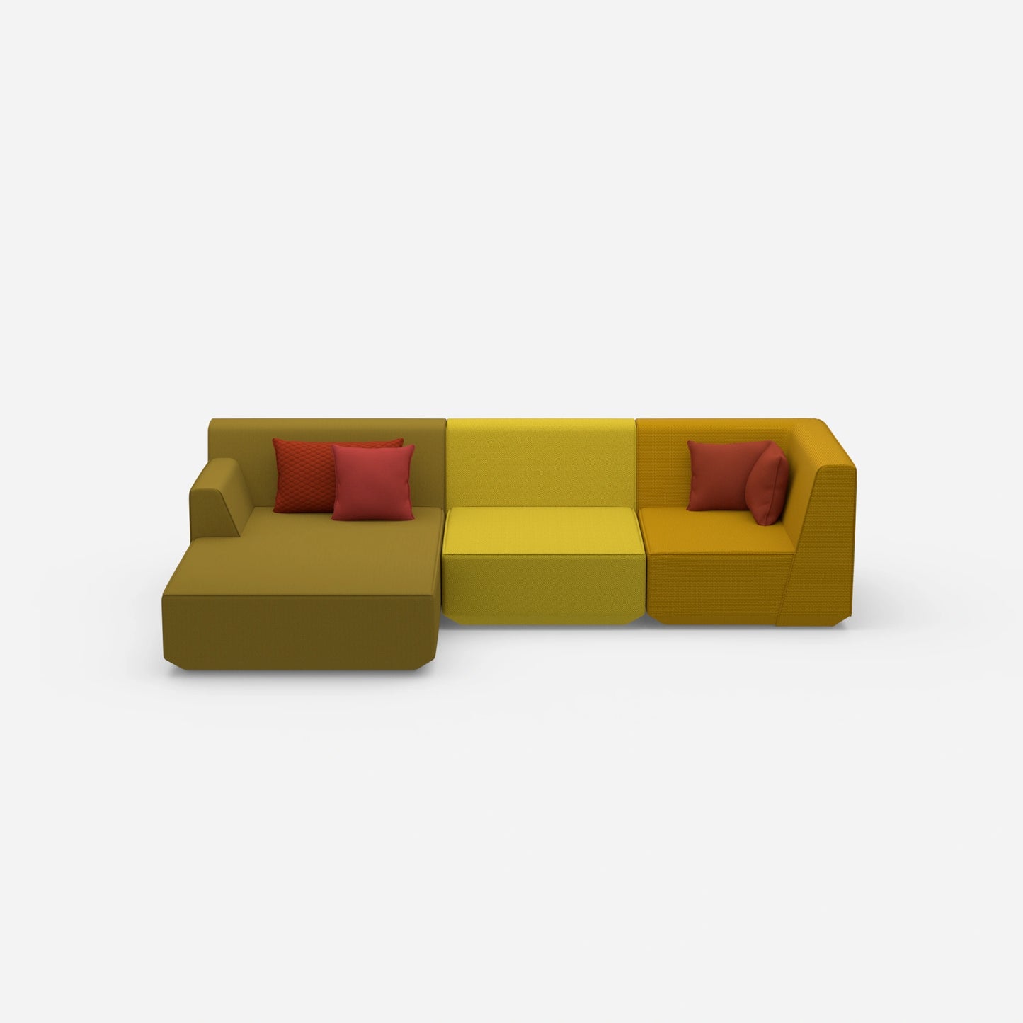 Différents modules de canapés Cubit configurés dans un grand espace ouvert - montre la diversité des combinaisons et des couleurs possibles