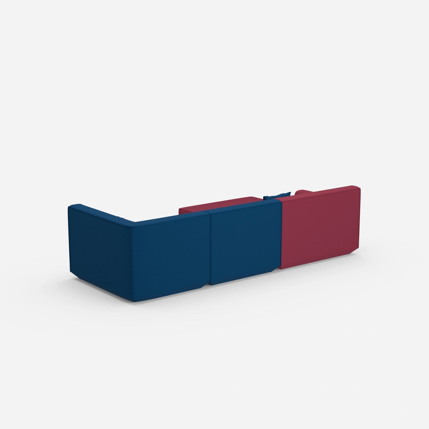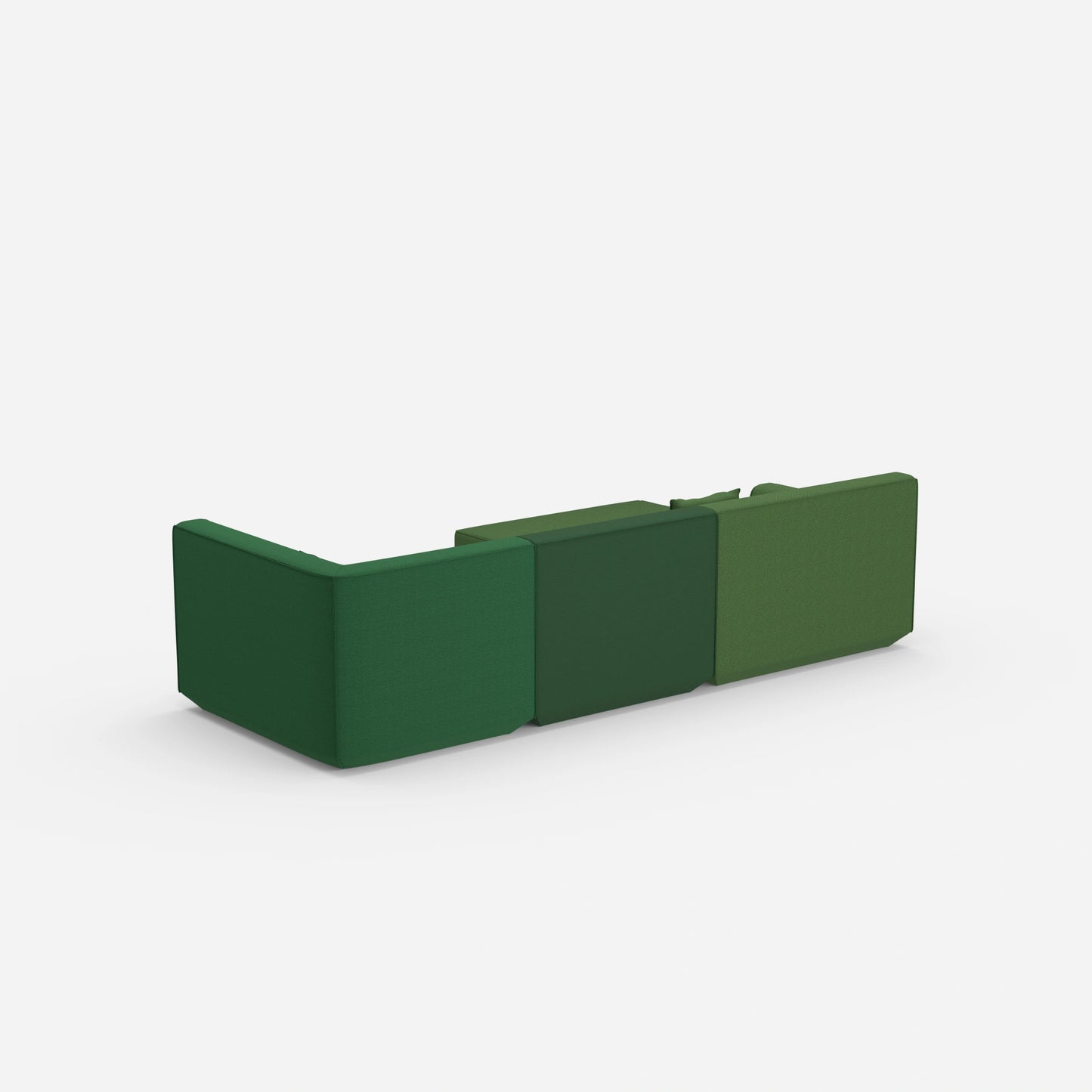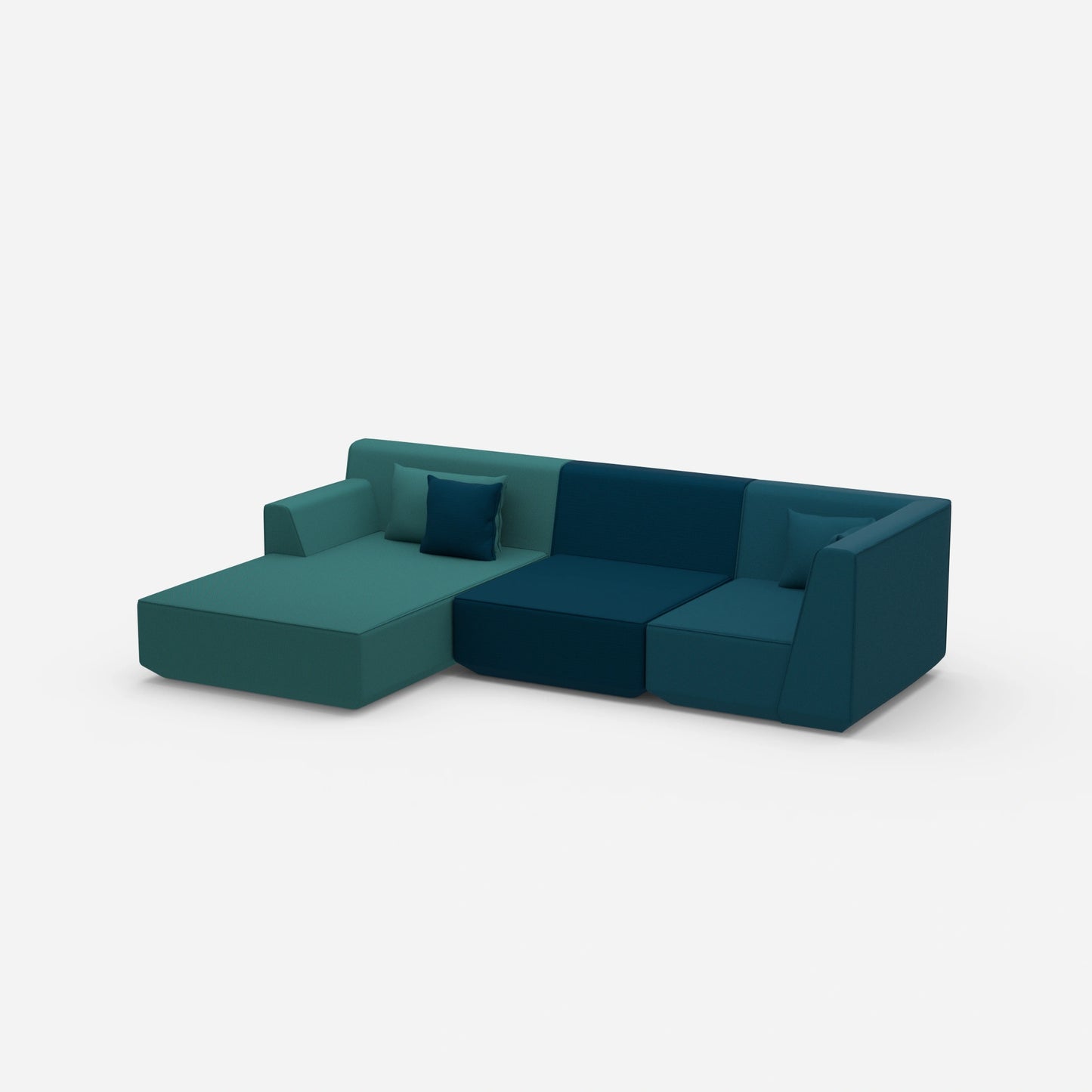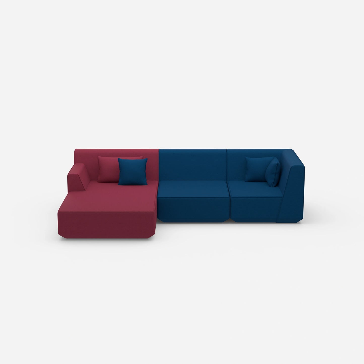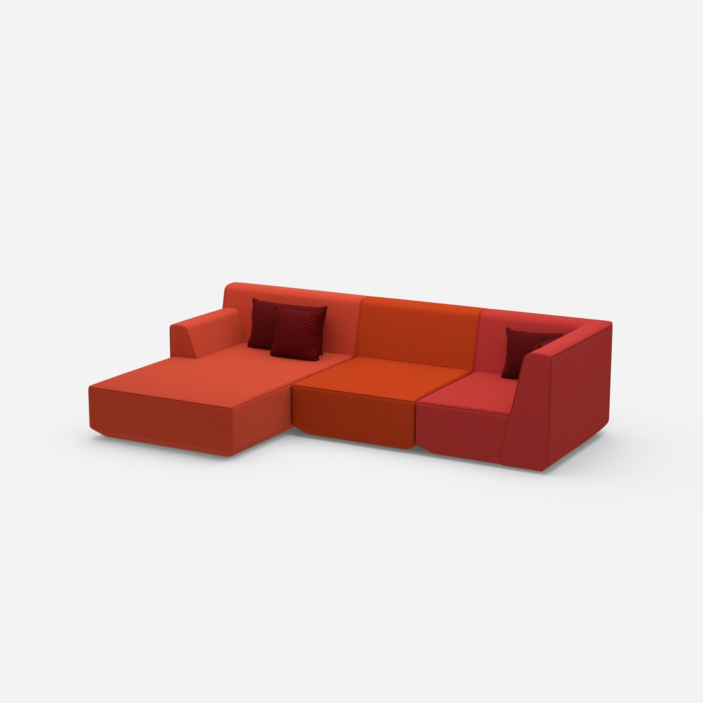 Différents modules de canapés Cubit configurés dans un grand espace ouvert - montre la diversité des combinaisons et des couleurs possibles