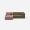 Intérieur d'un Showrooms lumineux avec cheminée et canapés modulaires Cubit dans différentes nuances de vert