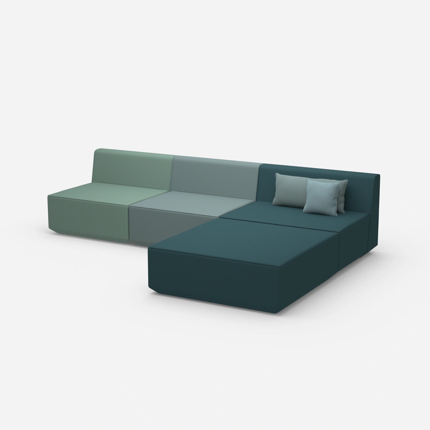 Différents modules de canapés Cubit configurés dans un grand espace ouvert - montre la diversité des combinaisons et des couleurs possibles