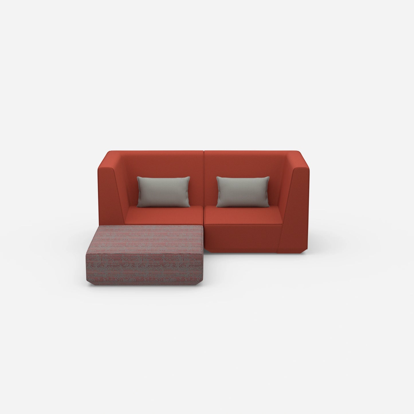 Deux éléments de canapé modulaires et un coussin avec des motifs de tissu appliqués dans une pièce lumineuse, prêts à être vus par les clients.