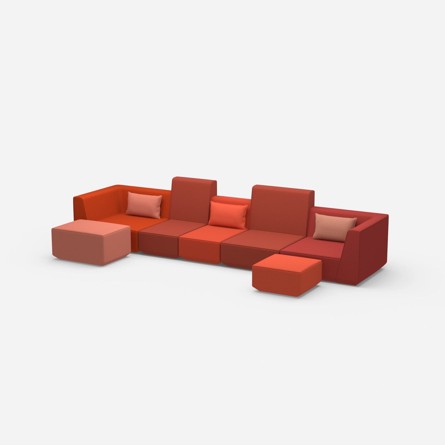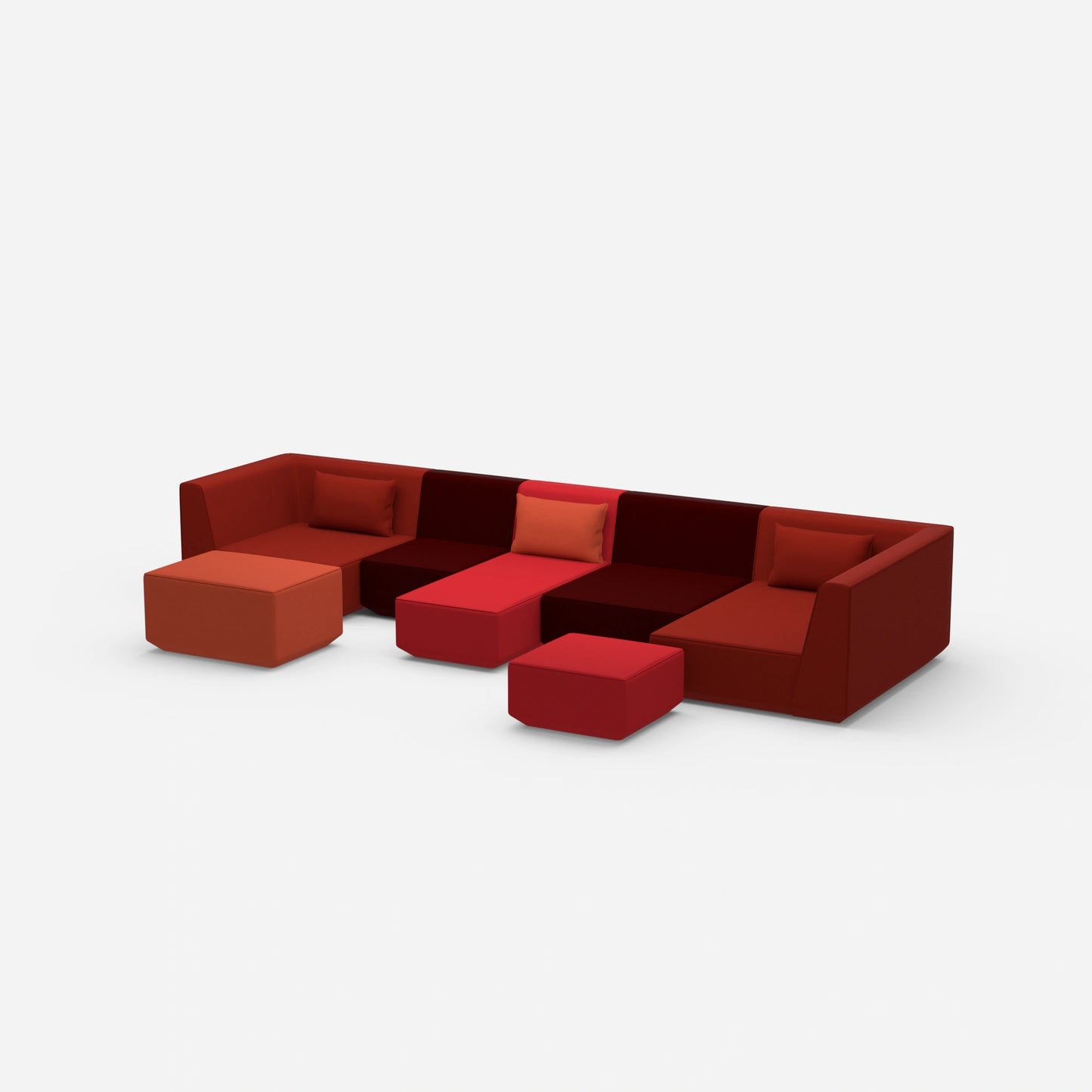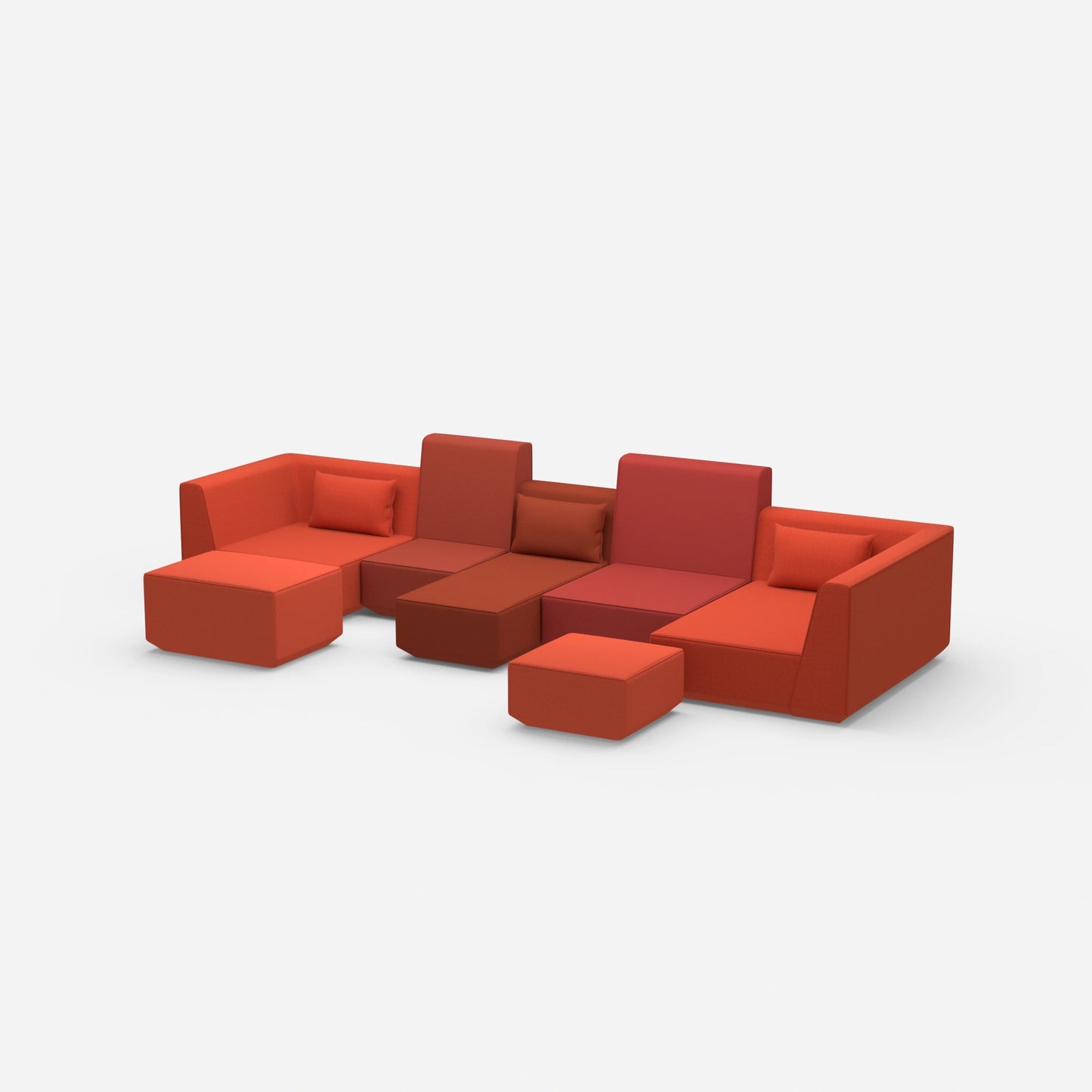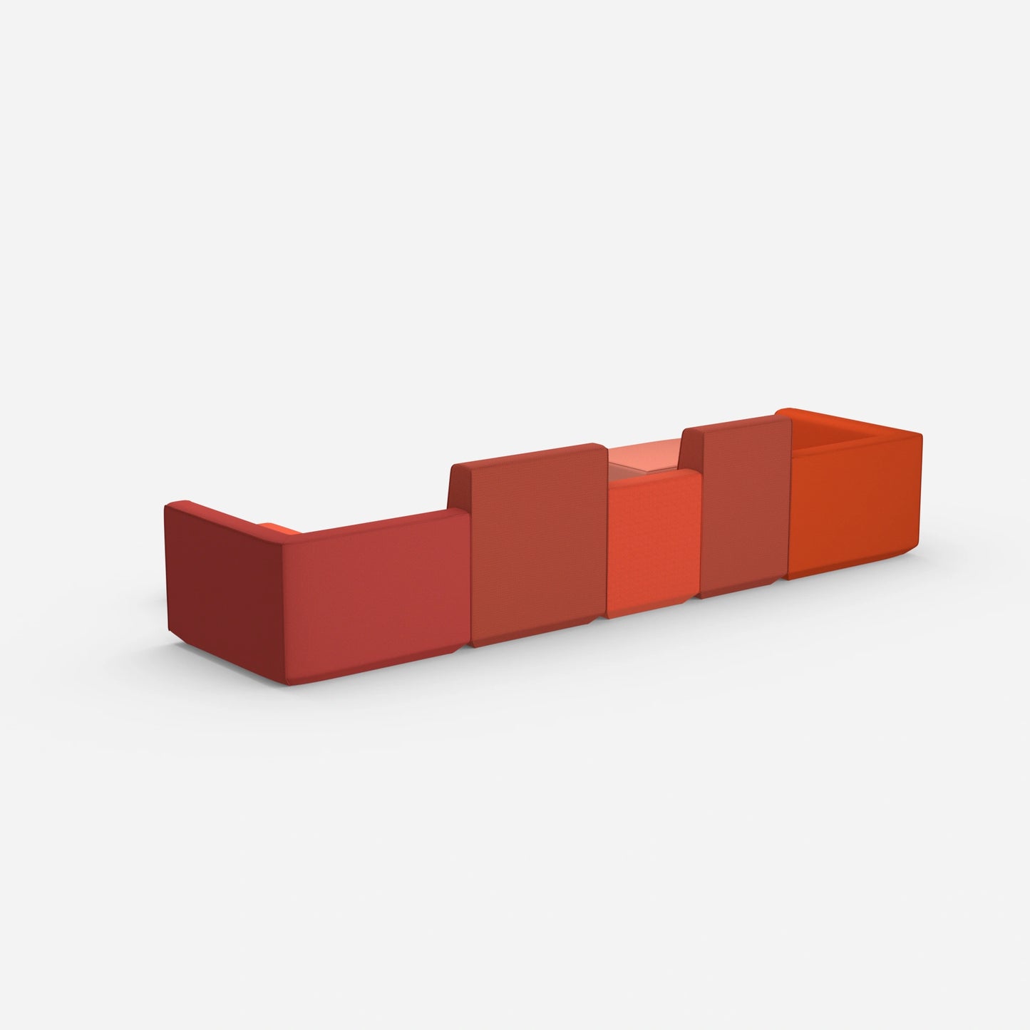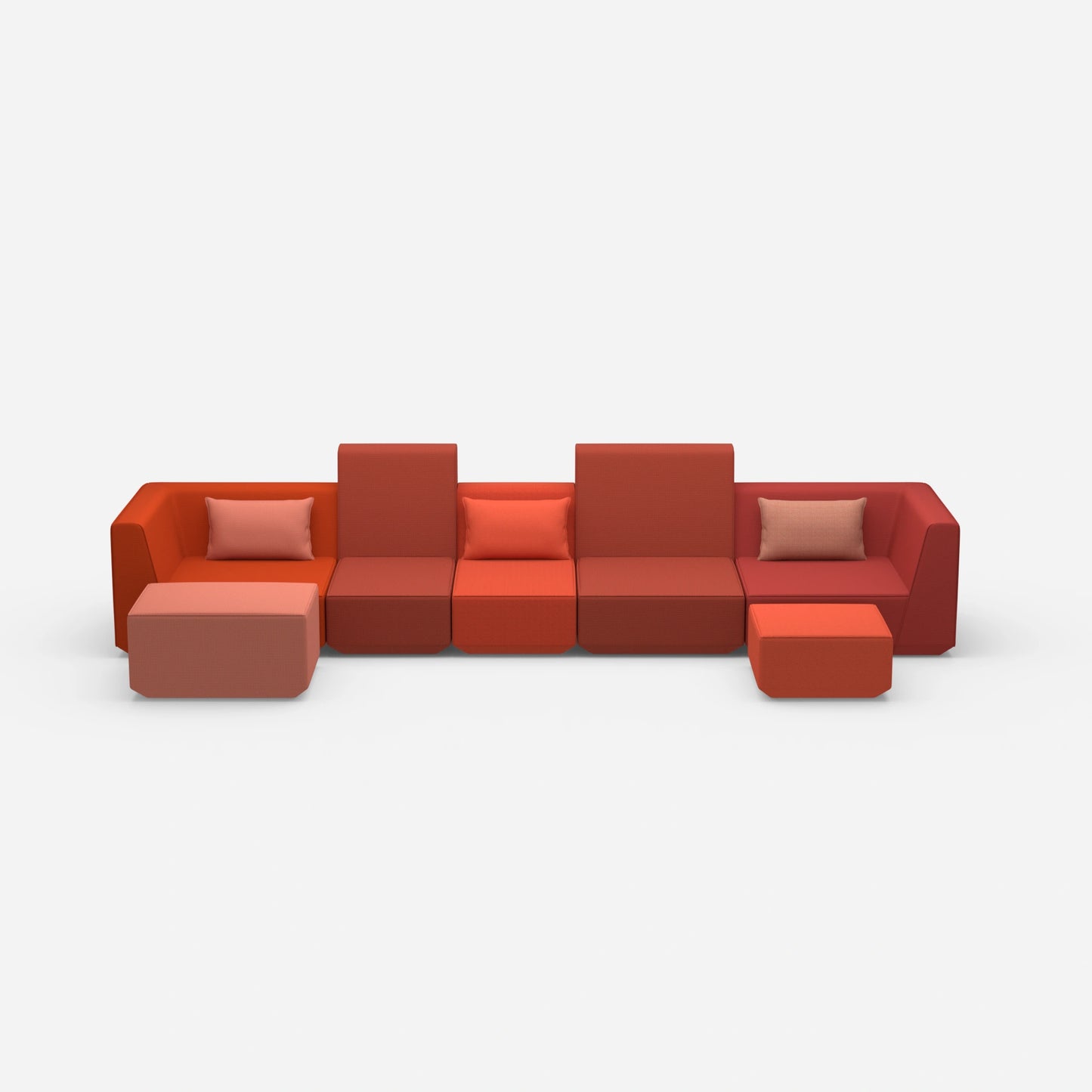 Différents modules de canapés Cubit configurés dans un grand espace ouvert - montre la diversité des combinaisons et des couleurs possibles