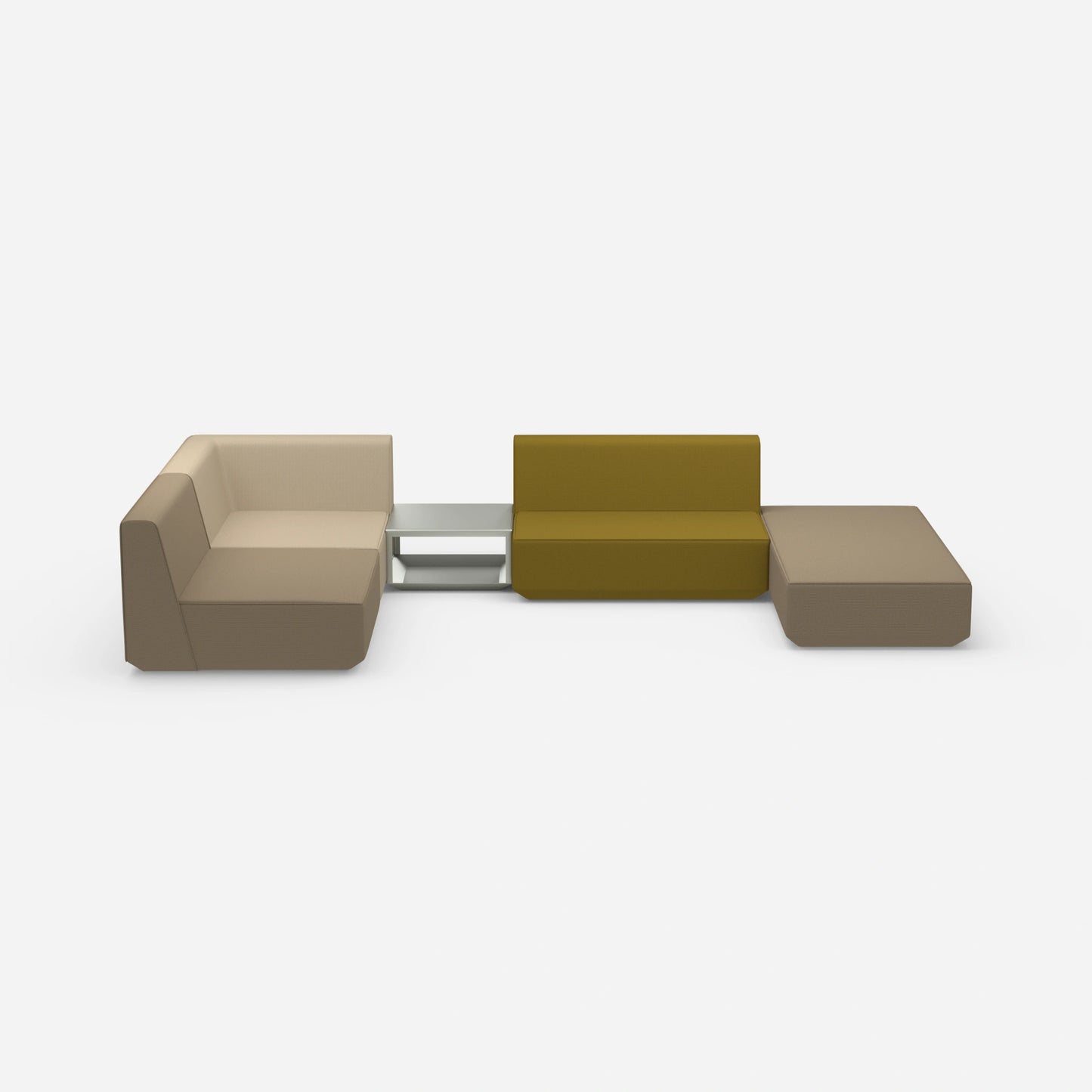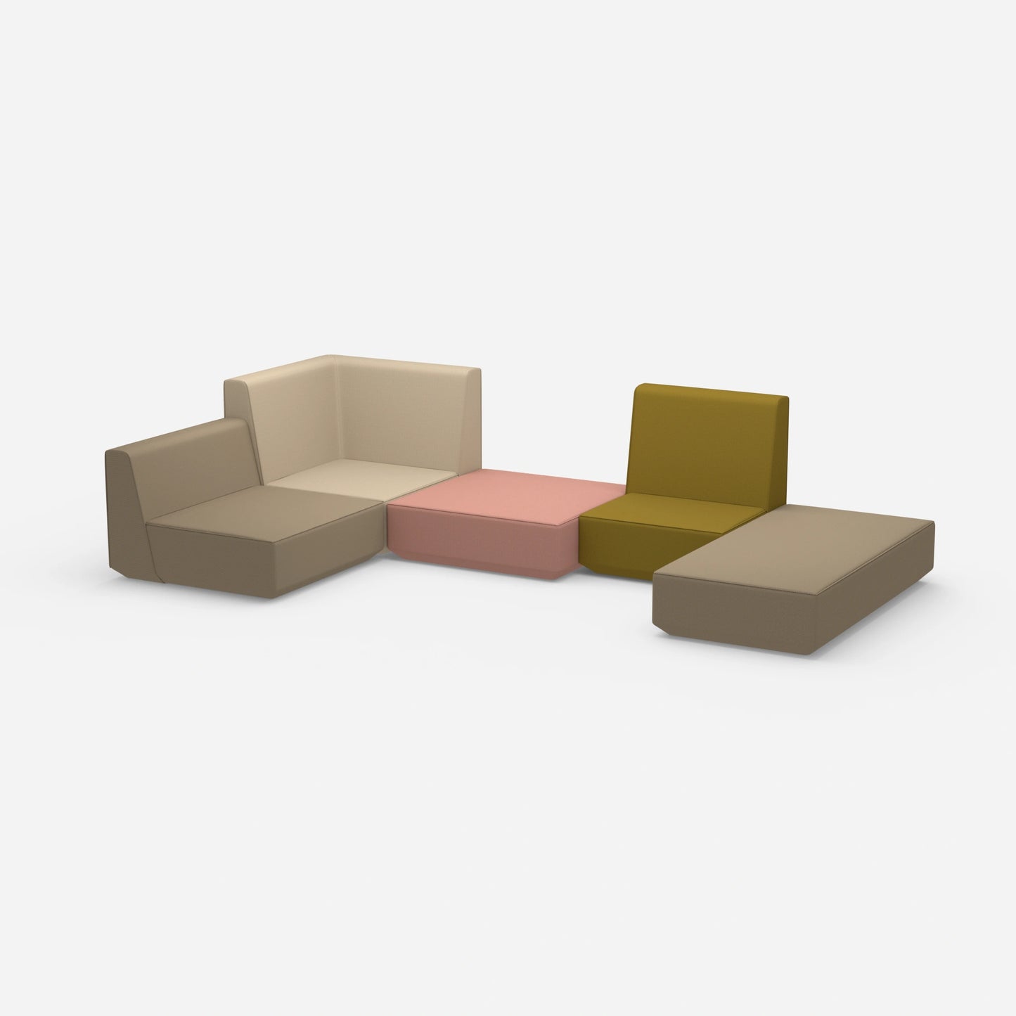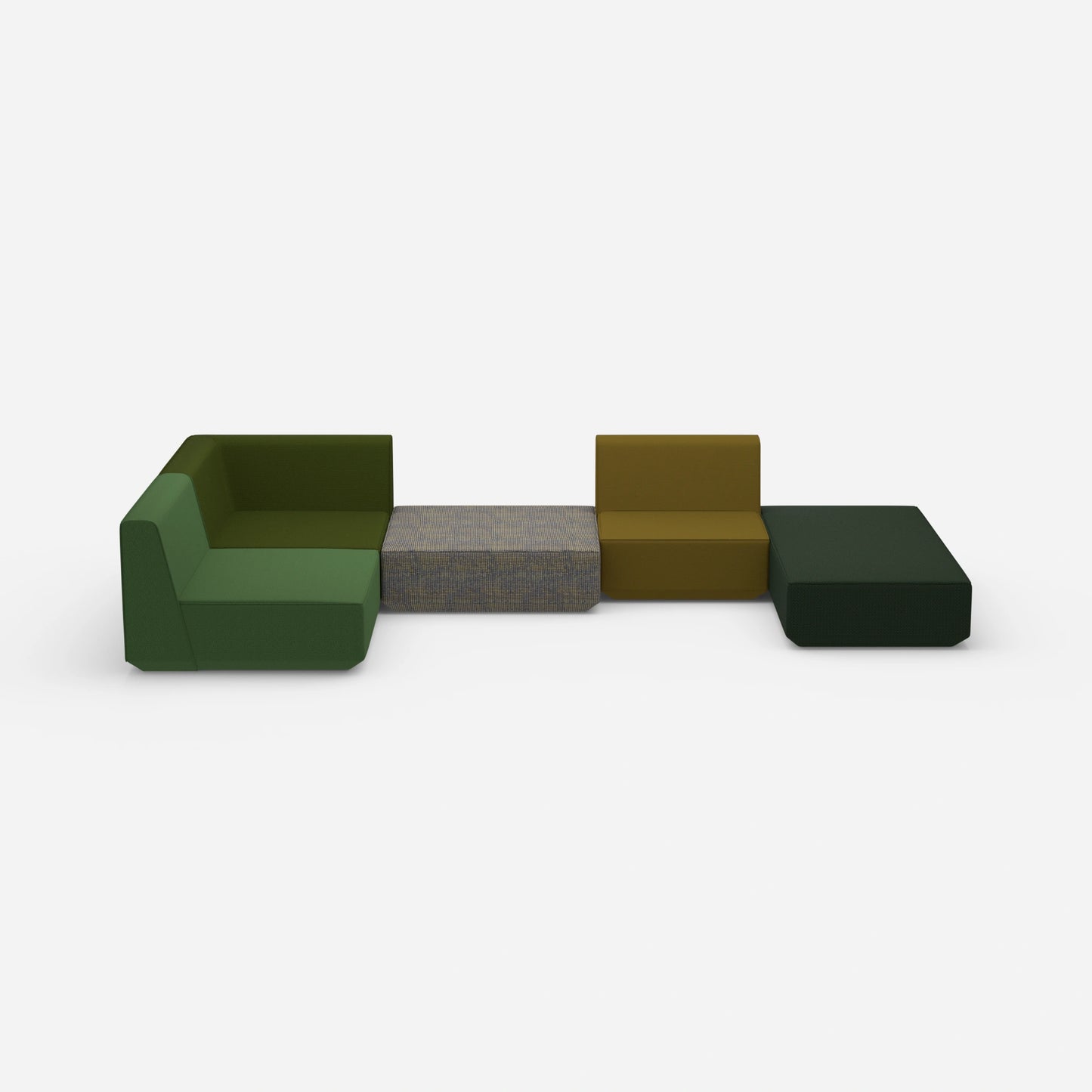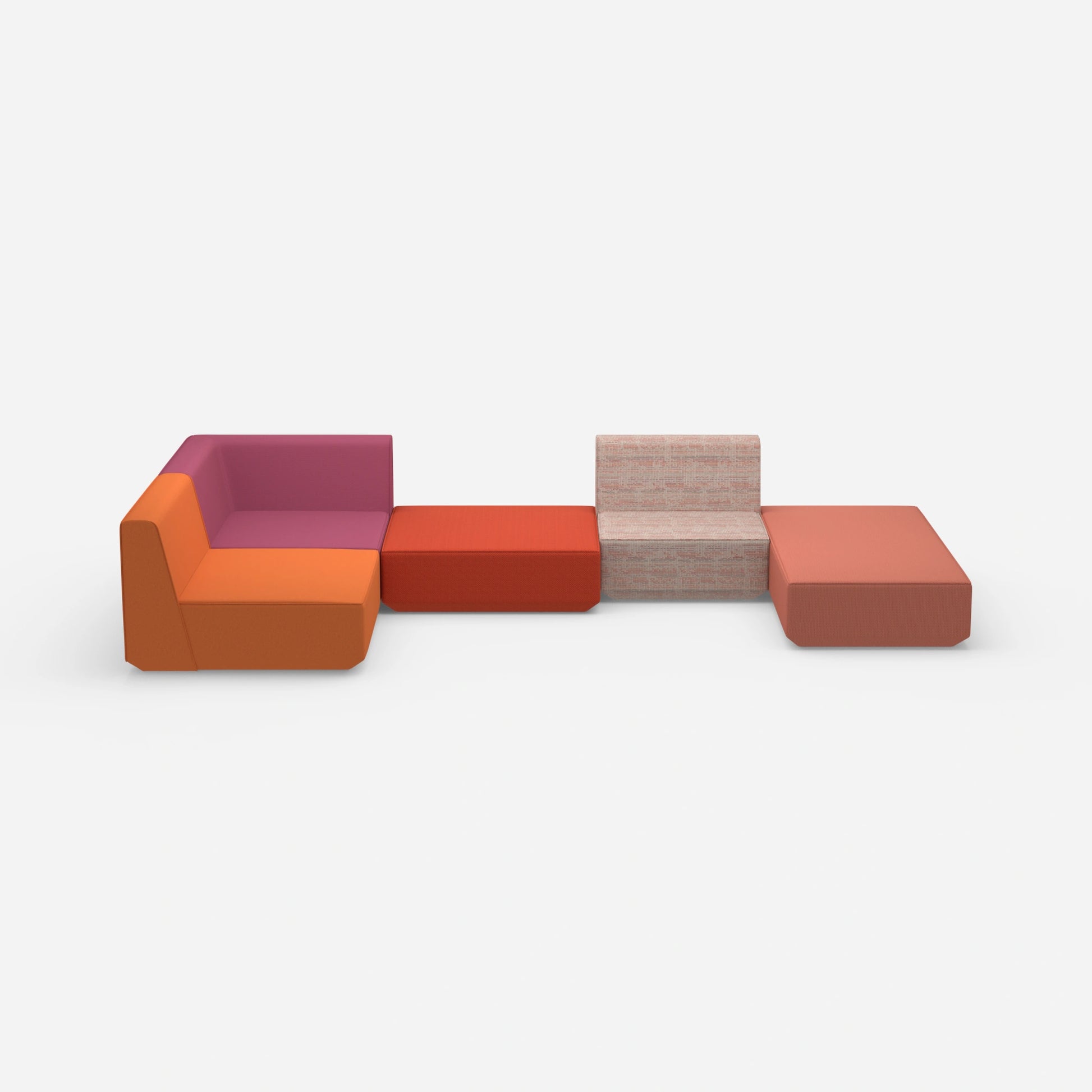 Différents modules de canapés Cubit configurés dans un grand espace ouvert - montre la diversité des combinaisons et des couleurs possibles