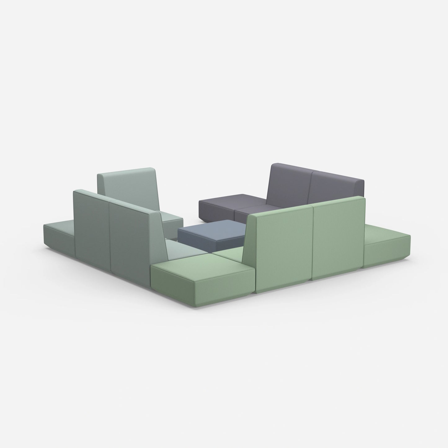 Différents modules de canapés Cubit configurés dans un grand espace ouvert - montre la diversité des combinaisons et des couleurs possibles