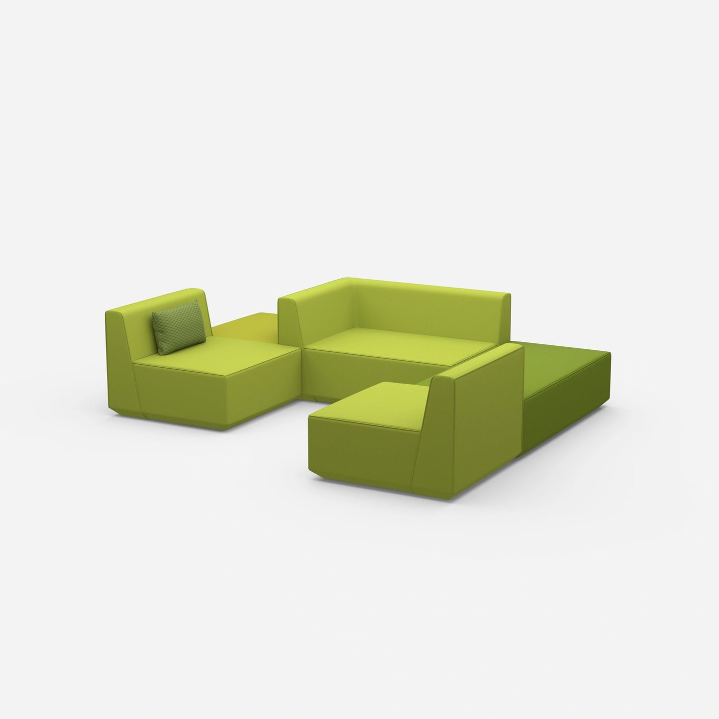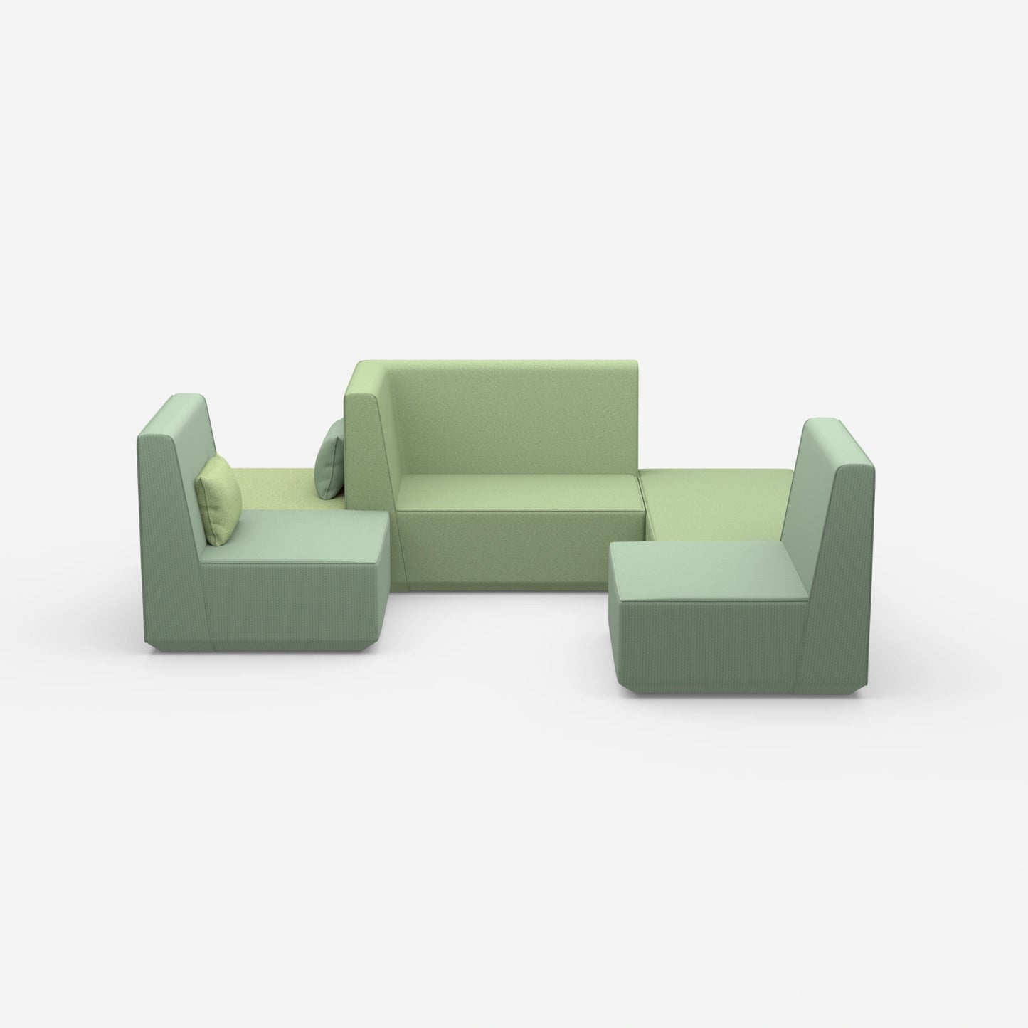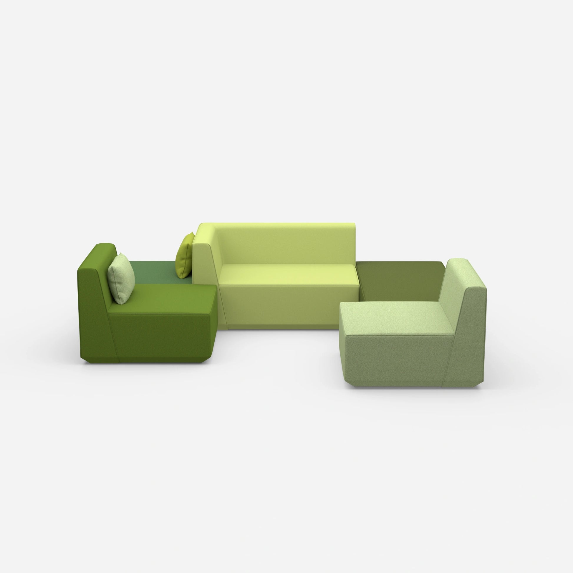 Différents modules de canapés Cubit configurés dans un grand espace ouvert - montre la diversité des combinaisons et des couleurs possibles