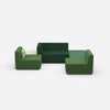 Intérieur d'un Showrooms lumineux avec cheminée et canapés modulaires Cubit dans différentes nuances de vert