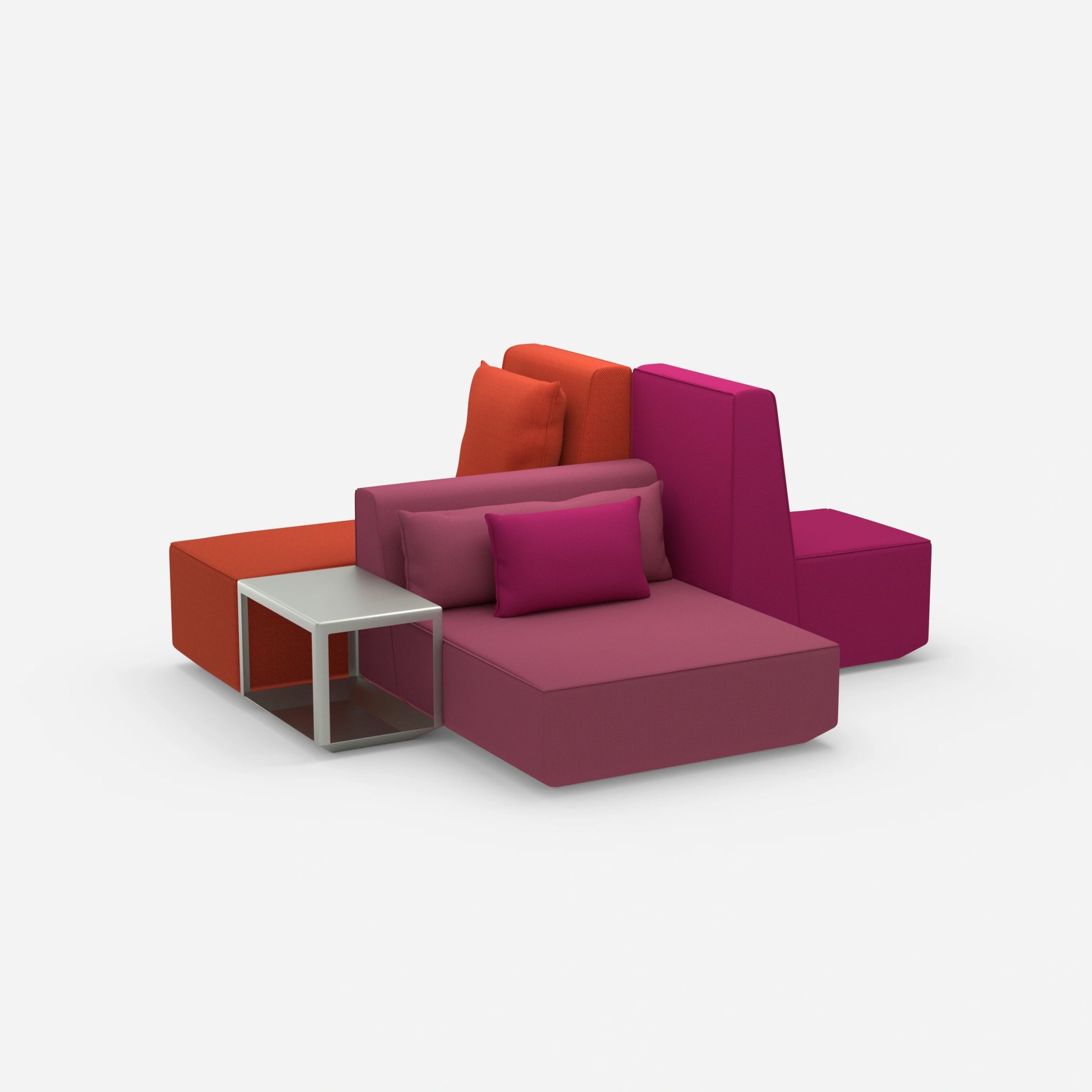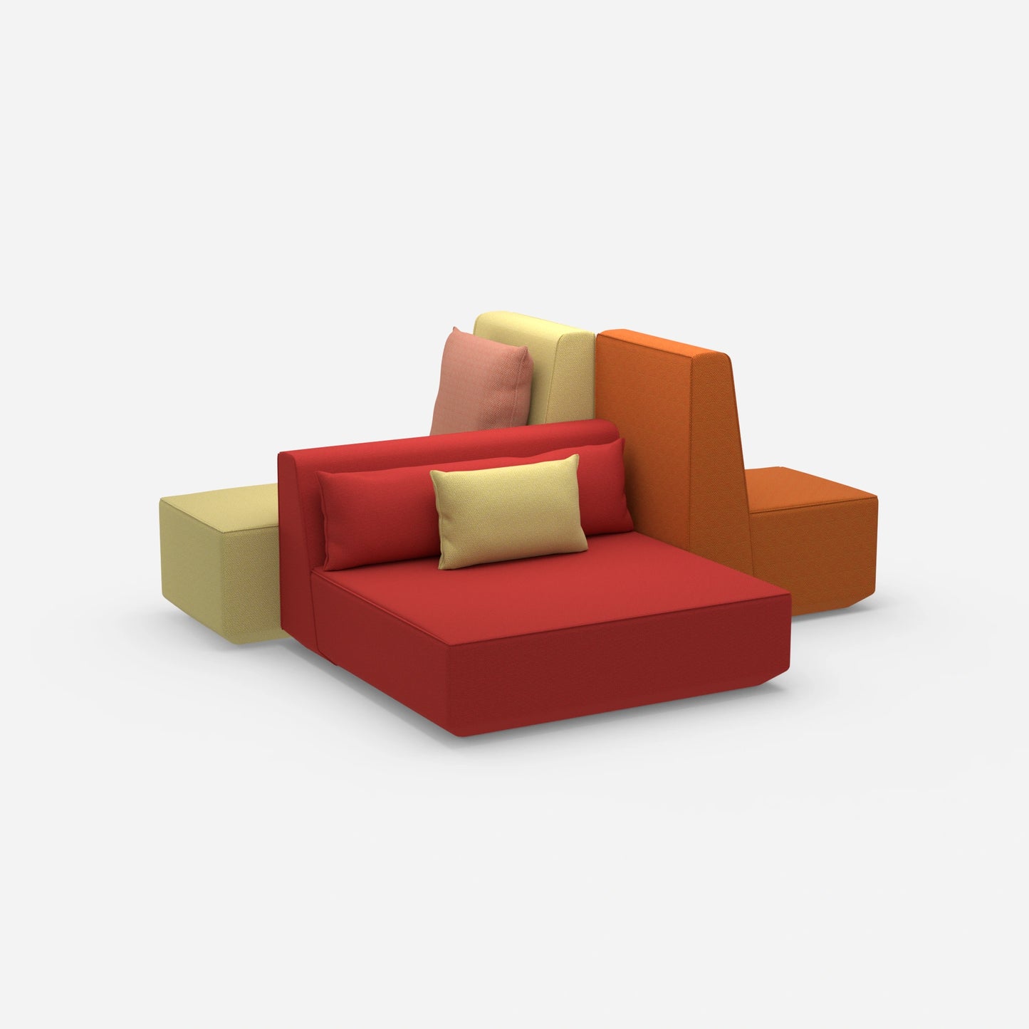 Différents modules de canapés Cubit configurés dans un grand espace ouvert - montre la diversité des combinaisons et des couleurs possibles