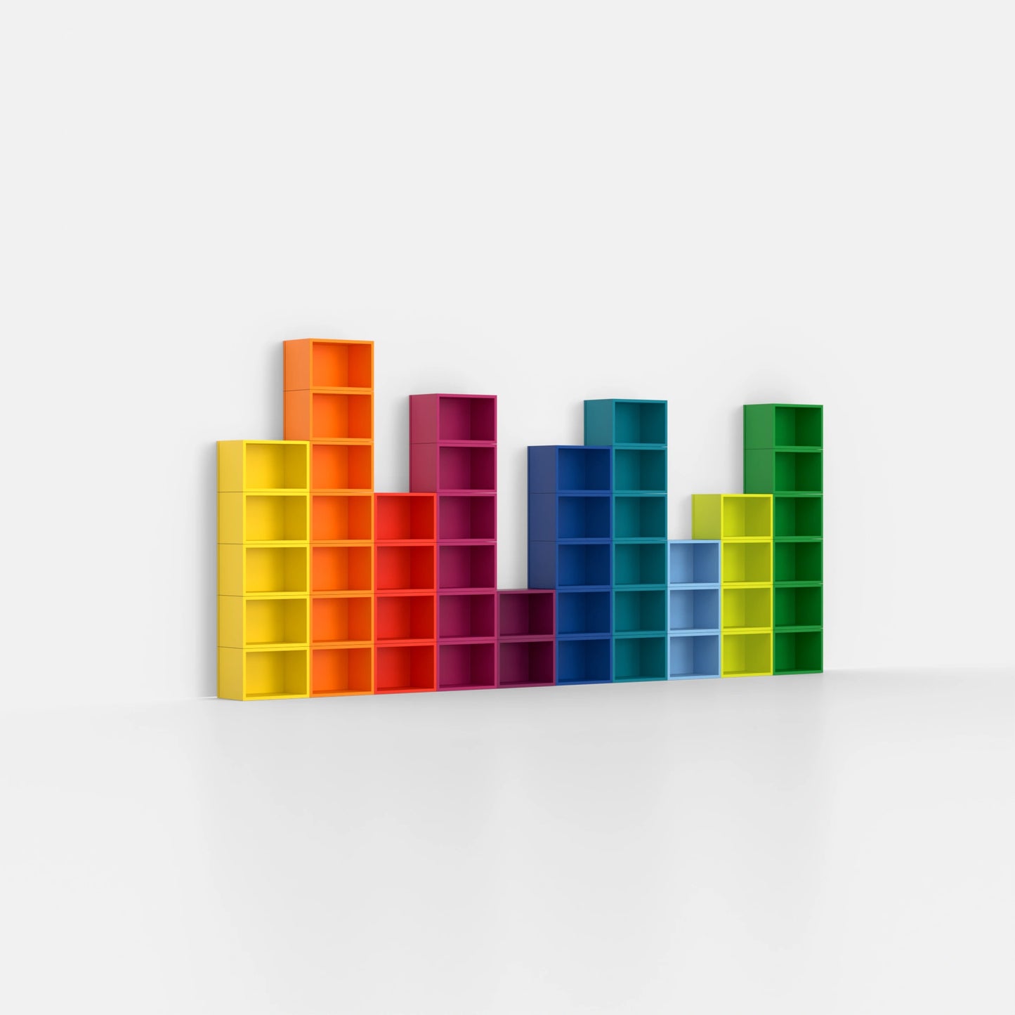 Des étagères Cubit dans toutes les couleurs de l'arc-en-ciel comme installation murale, ordonnées dans un dégradé de couleurs fluide - l'expression d'une diversité de couleurs et d'une liberté d'aménagement maximales