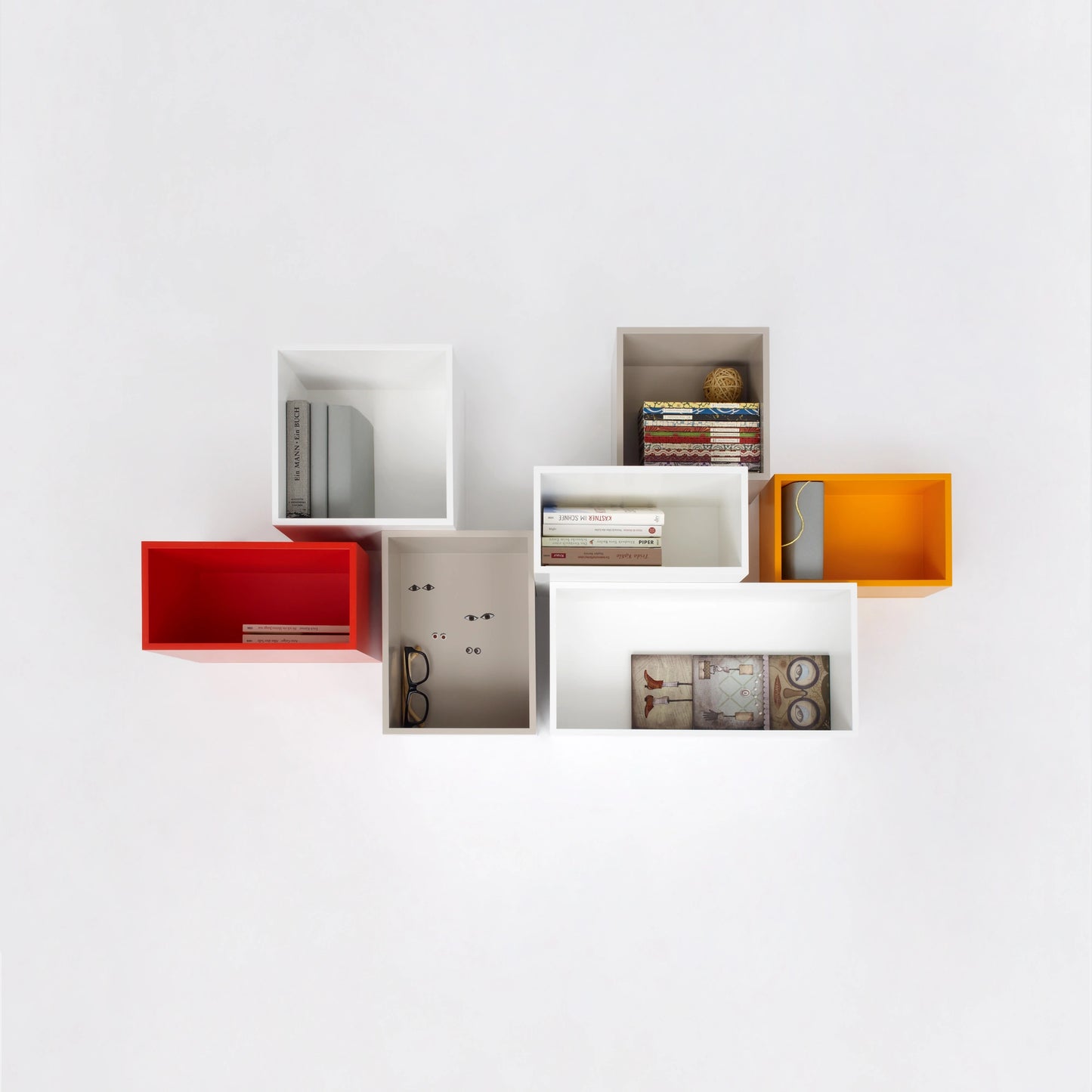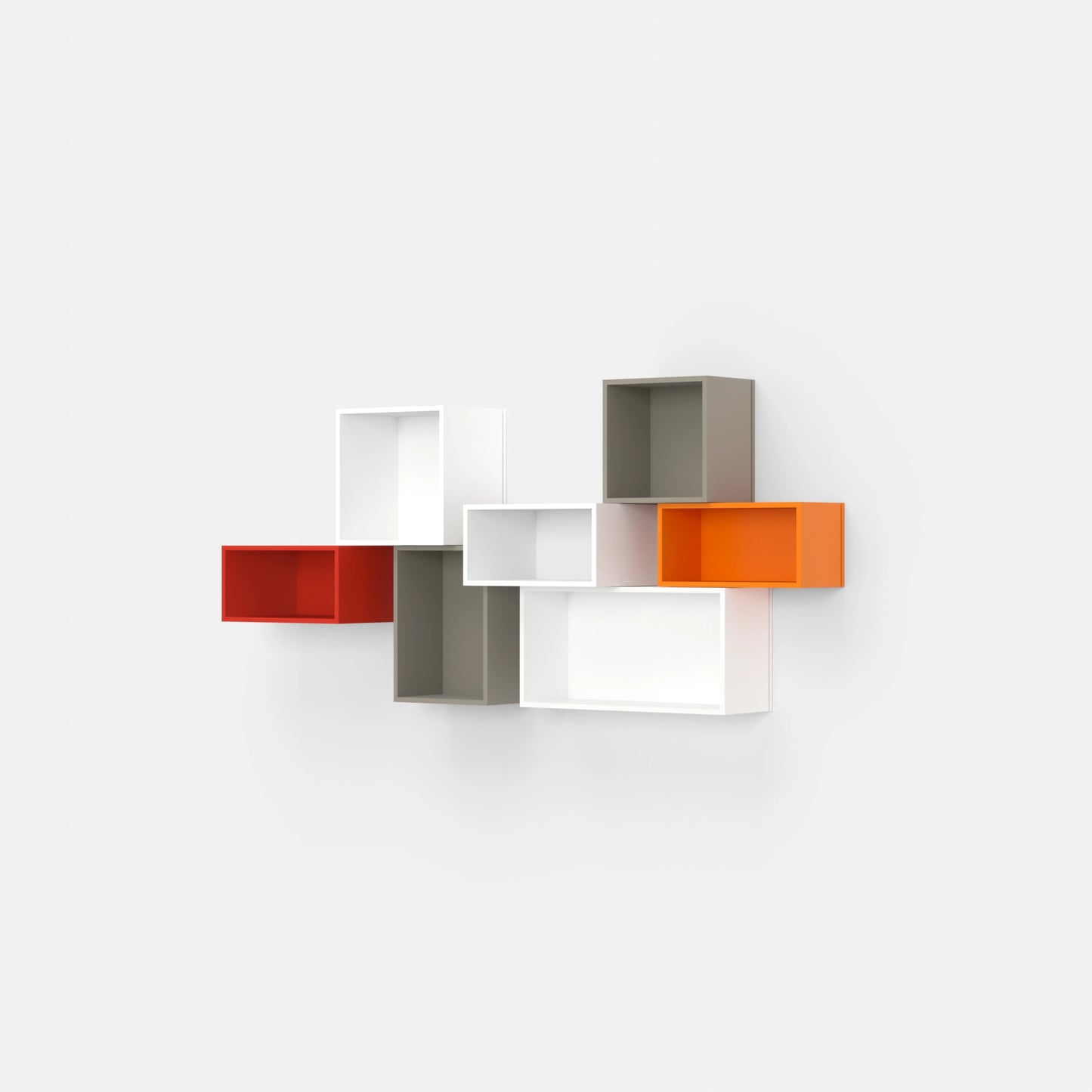 Cubit Étagère murale composée de modules colorés dans des tons de rouge, de rose et de jaune, disposés de manière dynamique pour un design d'espace vivant
