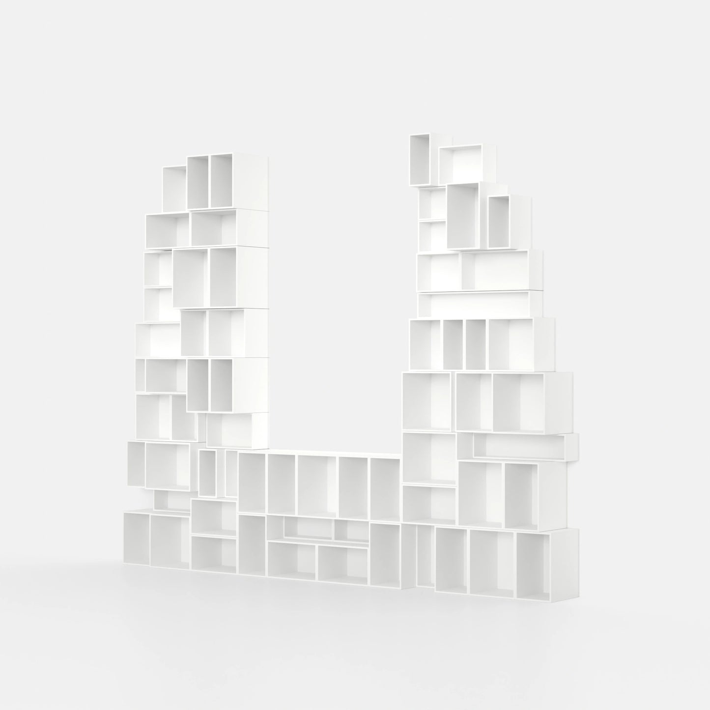 Les modules d'étagères s'orientent vers les formats courants de littérature et de musique, par exemple Din A4, A5, classeurs, atlas, livres d'images & disques. Cette grille de tailles provenant du contenu permet d'obtenir un look sculptural unique.