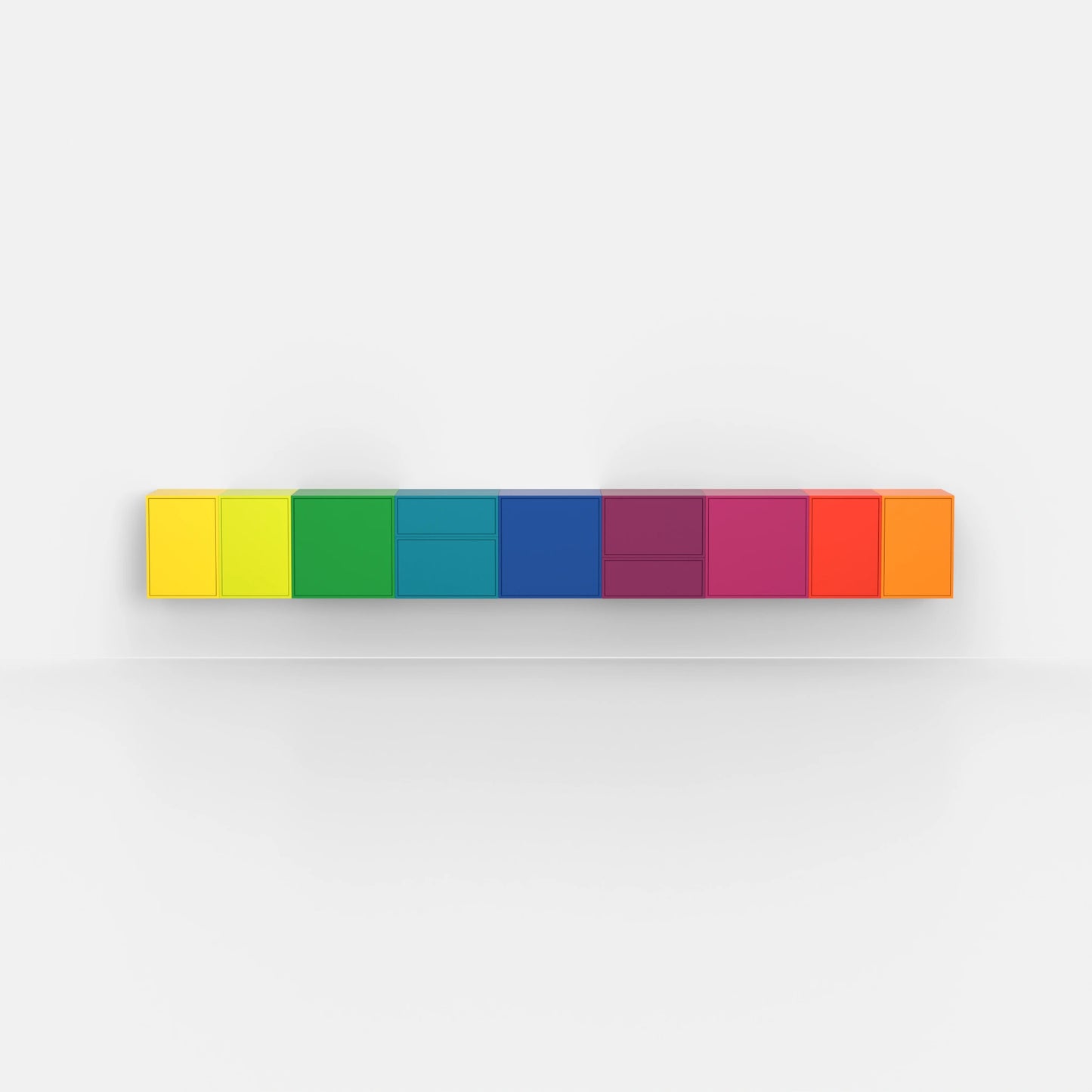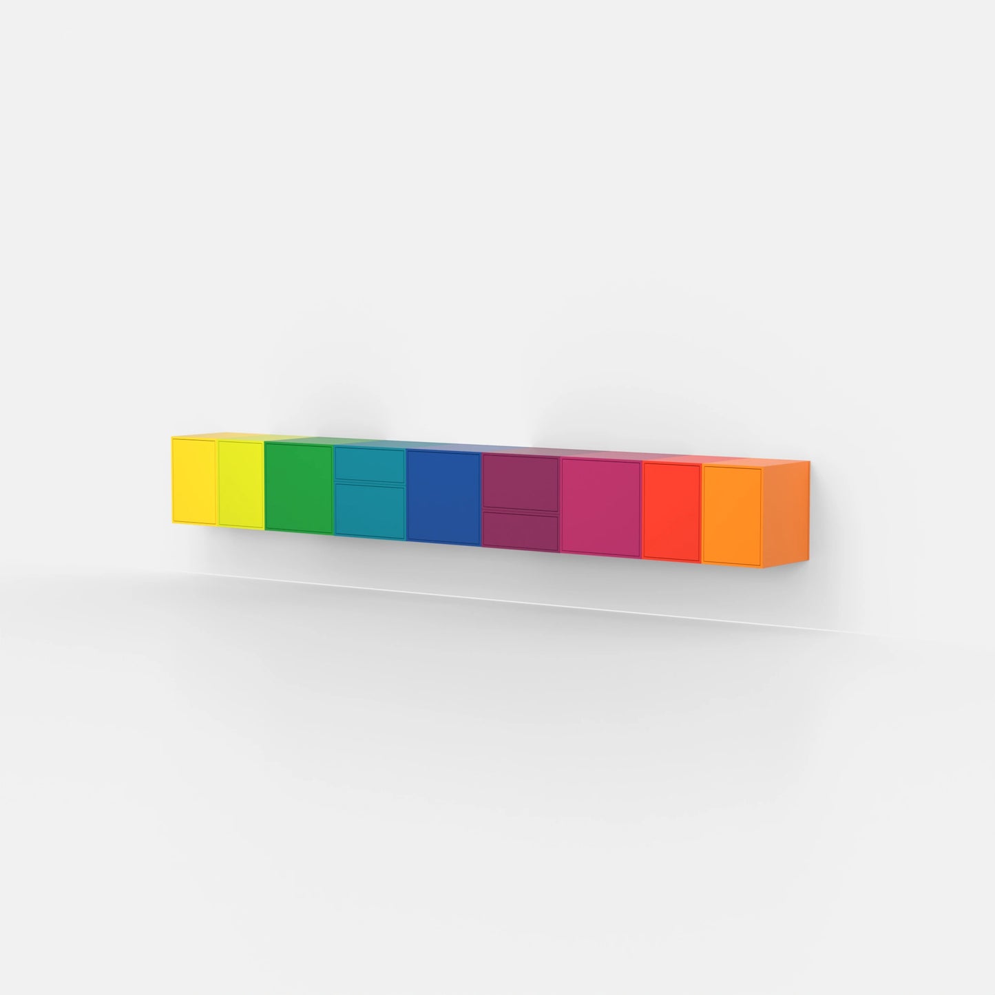 Des étagères Cubit dans toutes les couleurs de l'arc-en-ciel comme installation murale, ordonnées dans un dégradé de couleurs fluide - l'expression d'une diversité de couleurs et d'une liberté d'aménagement maximales