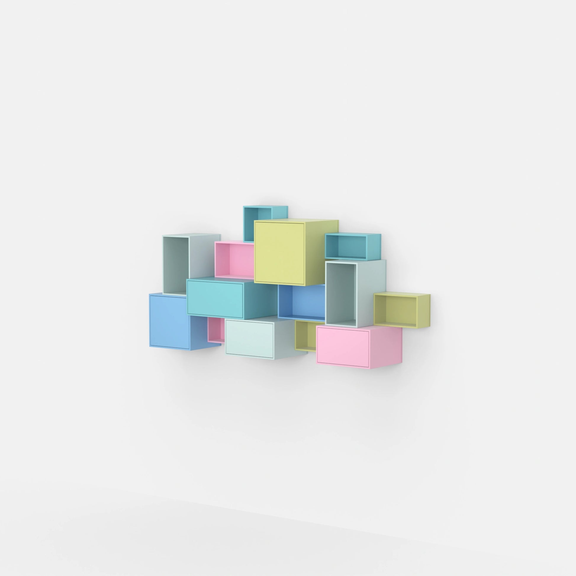 Des étagères Cubit dans toutes les couleurs de l'arc-en-ciel comme installation murale, ordonnées dans un dégradé de couleurs fluide - l'expression d'une diversité de couleurs et d'une liberté d'aménagement maximales