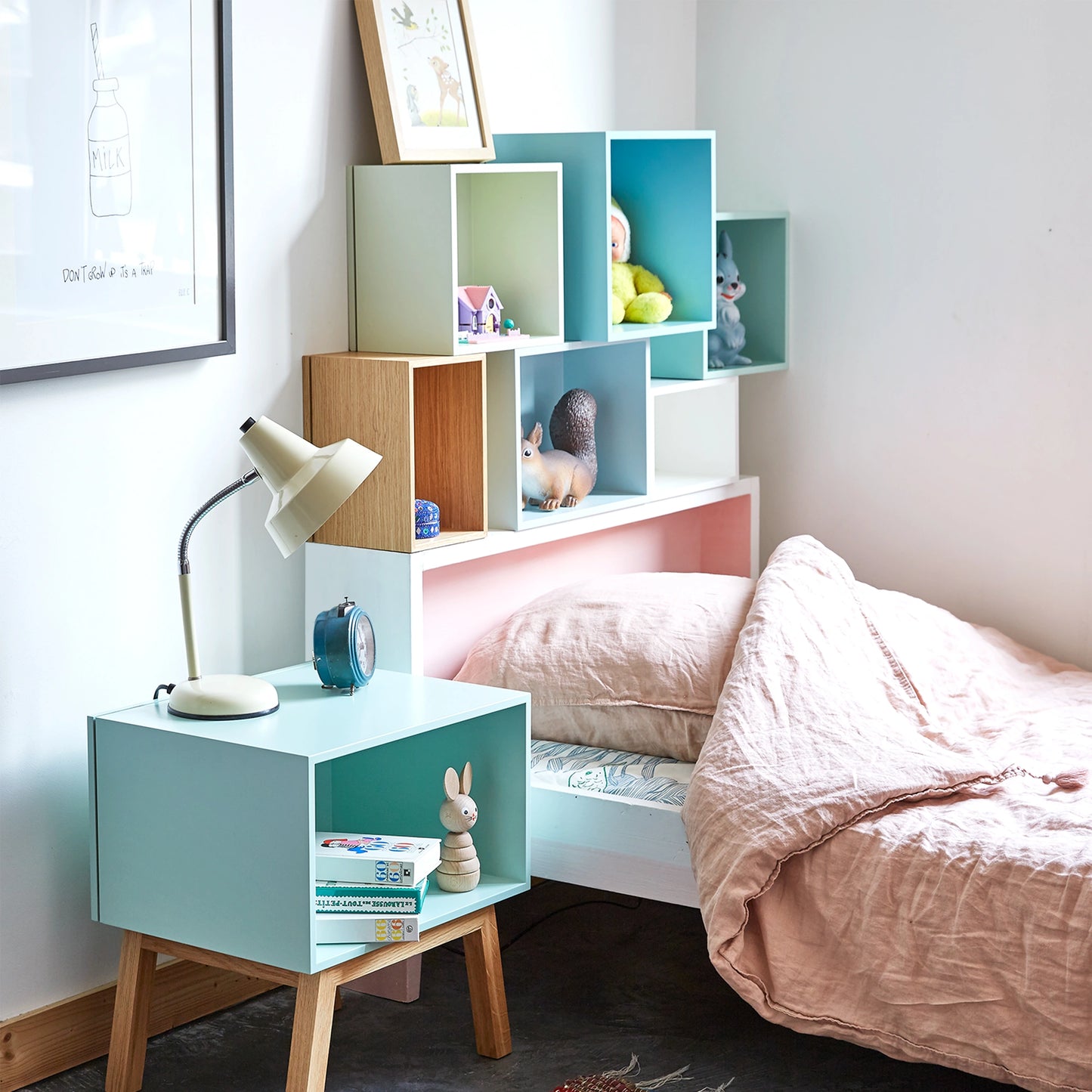 La palette de couleurs est variée : blanc, bois chêne ambré, lagon clair, light grey et bleu glacier. Chaque nuance crée une ambiance unique - de l'ambre apaisant au bleu glacier vif. Ce choix permet d'adapter facilement L'étagère aux couleurs existantes.