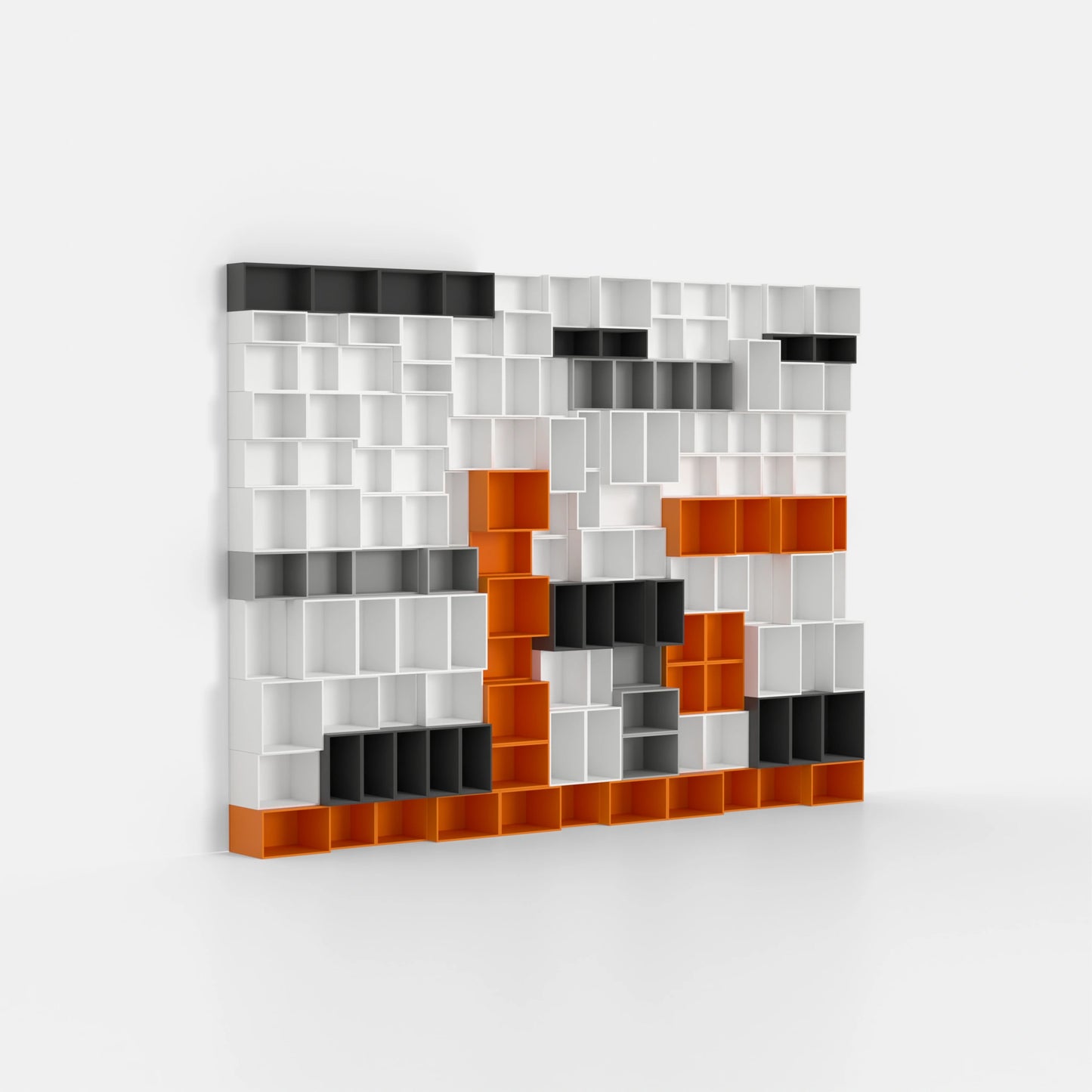 L'Étagère murale RK114 augmente la fonctionnalité des espaces de vie et de travail. Avec une largeur de 400 cm et une hauteur de 296 cm, elle offre une grande surface. Sa profondeur de 37 cm permet un espace de rangement grâce à 140 modules flexibles. Vous avez des problèmes de place ? Cette solution s'adapte parfaitement, avec des couleurs comme le blanc éclatant, le light grey stylé ou le orange buddha vif.