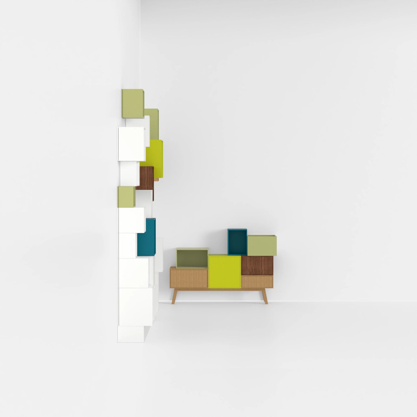 Trois boîtes d'étagères modulaires Cubit, deux en vert clair et une en placage de noyer, disposées librement sur le sol, une autre sur une structure métallique noire
