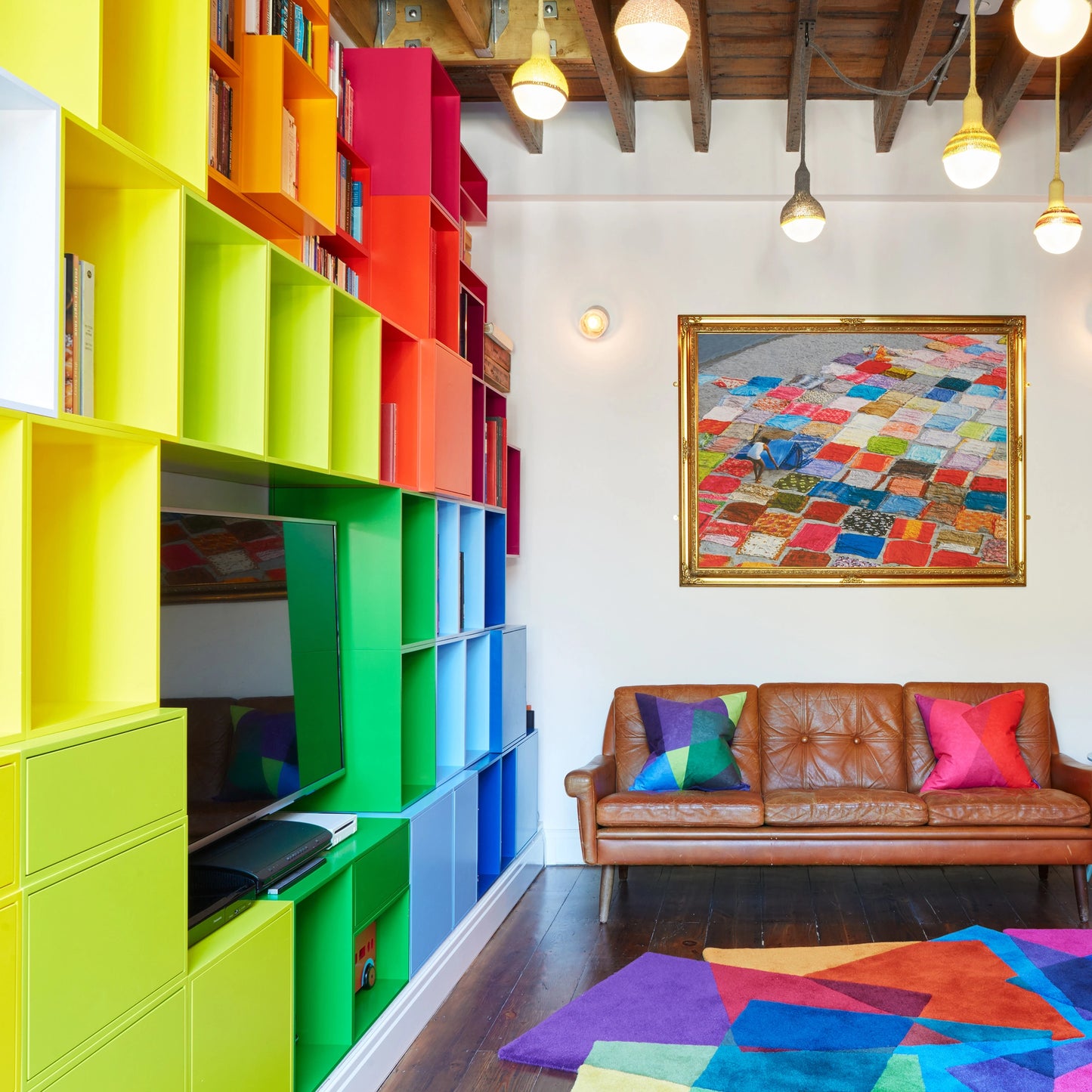 Des étagères Cubit dans toutes les couleurs de l'arc-en-ciel comme installation murale, ordonnées dans un dégradé de couleurs fluide - l'expression d'une diversité de couleurs et d'une liberté d'aménagement maximales