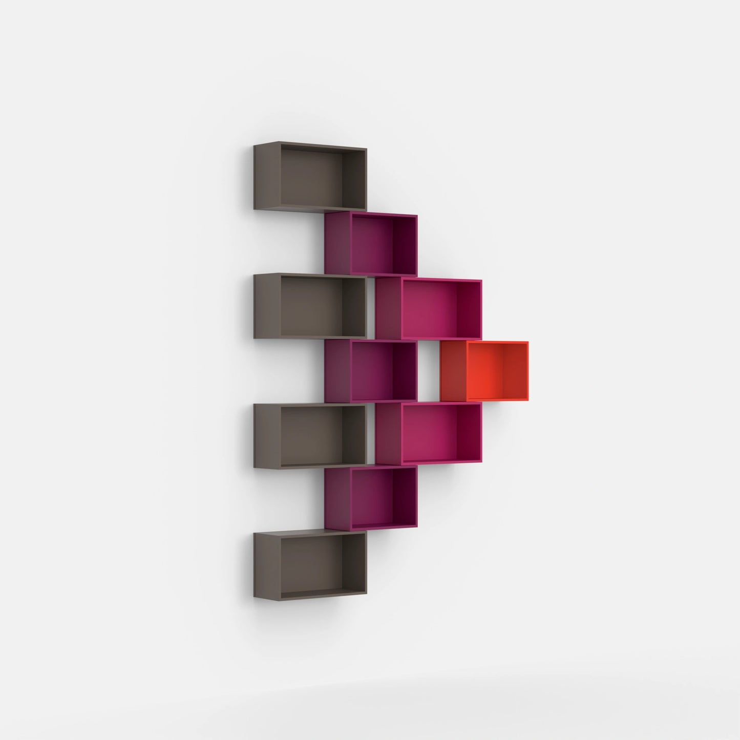 Cubit Étagère murale composée de modules colorés dans des tons de rouge, de rose et de jaune, disposés de manière dynamique pour un design d'espace vivant