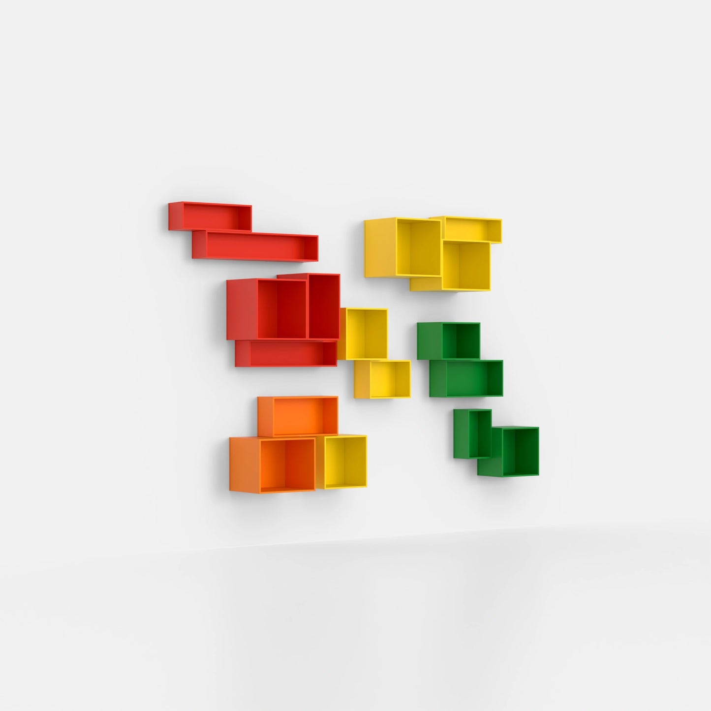 Cubit Étagère murale composée de modules colorés dans des tons de rouge, de rose et de jaune, disposés de manière dynamique pour un design d'espace vivant