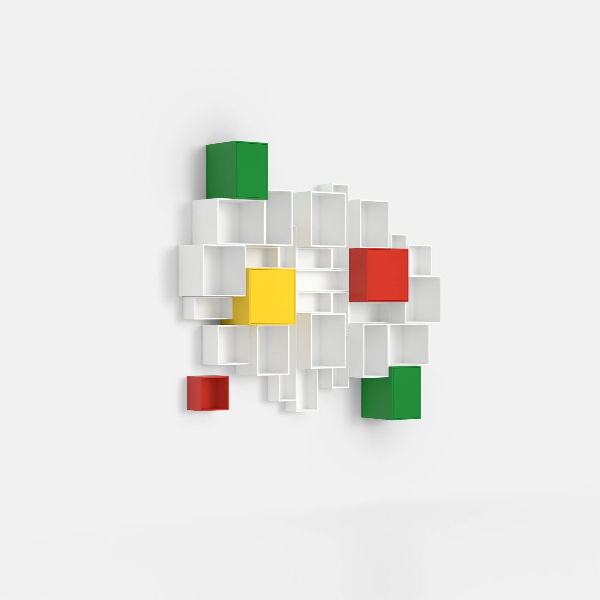 Cubit Étagère murale composée de modules colorés dans des tons de rouge, de rose et de jaune, disposés de manière dynamique pour un design d'espace vivant